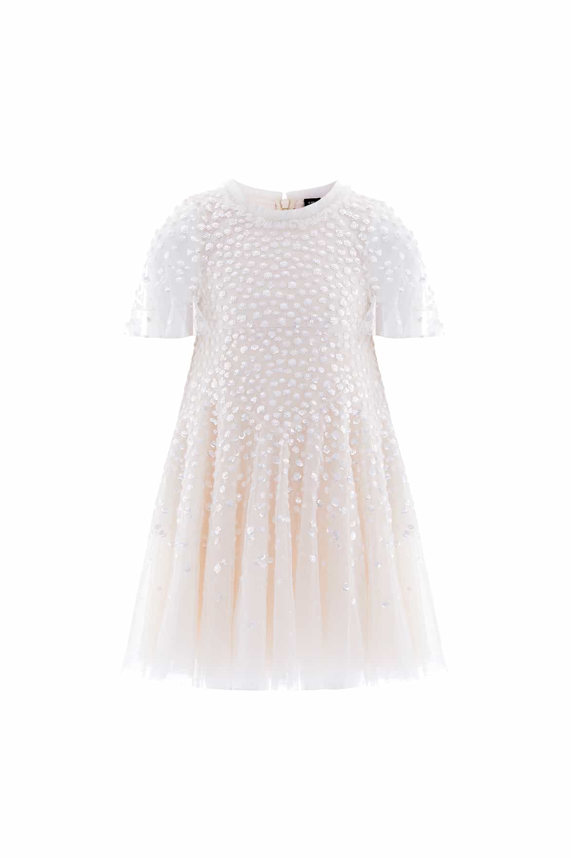The Dappled Sequin Short Cape Kids Dress in Cream. This dress sparkles with shimmering dot motifs that twinkle and dance toward the hem, creating a delightful glittering effect. The playful cape with a frilly edge adds a touch of fairytale magic, while the chevron seaming on the skirt ensures a flattering, pretty fit. The voluminous tulle skirt, with its soft, layered fullness, sways beautifully—perfect for endless twirls and making every moment feel like a dream come true.