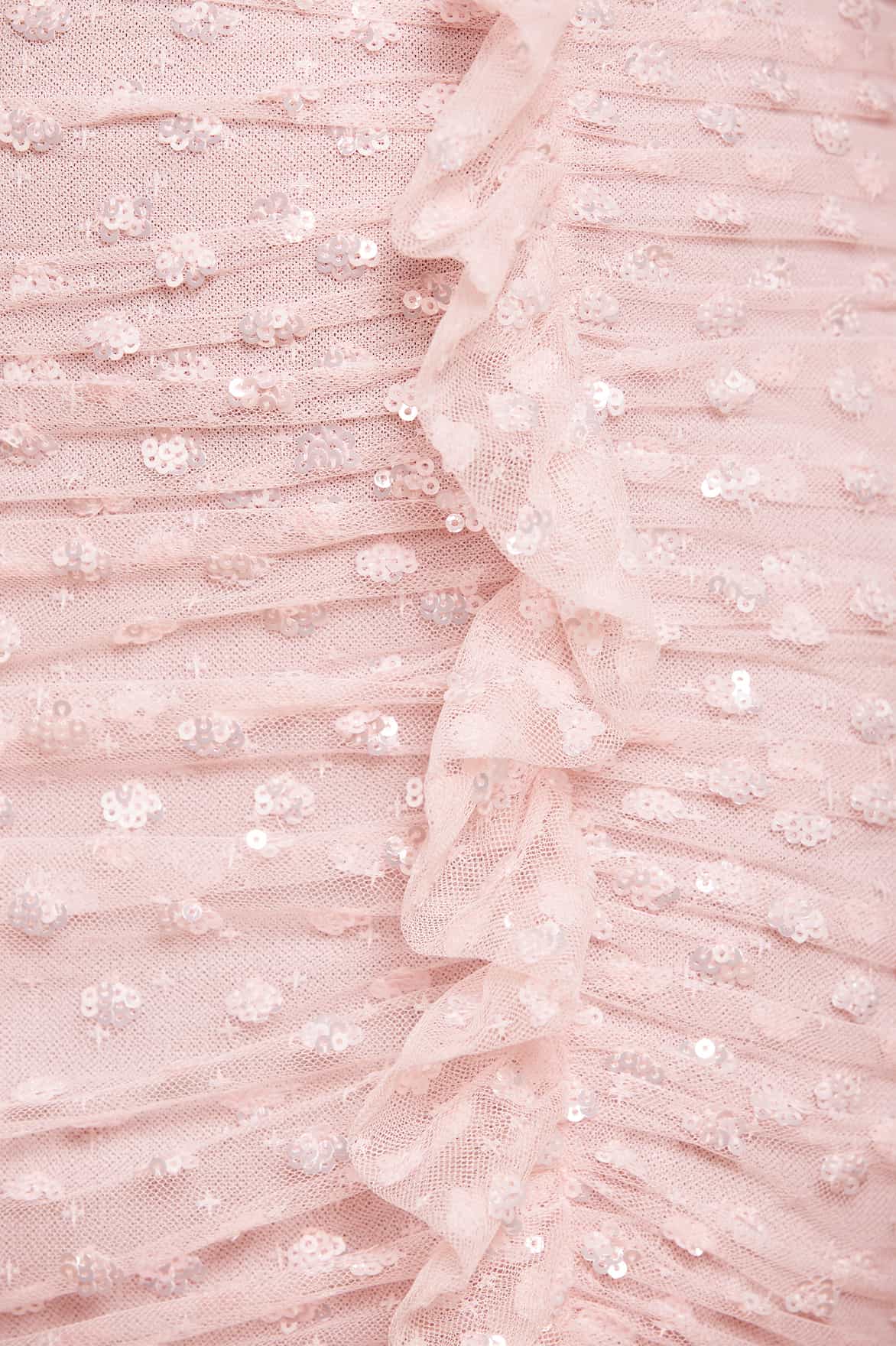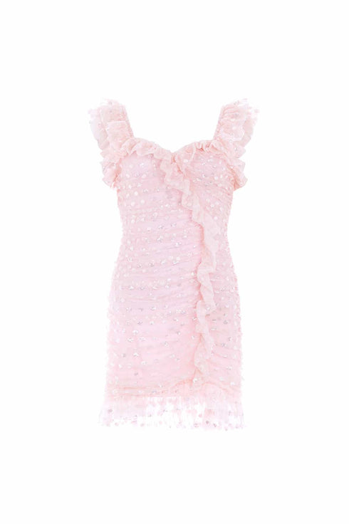 The Dotty Ruched Gloss Micro Mini Dress in Peony Pink. This mini dress is adorned with scattering sequins throughout, adding an all over romantic shimmering effect. The outside shell of this dress is created in our signature soft tulle. Gently gathered and perfectly engineered around the body to create the most flattering bodycon silhouette. The lining of this style in made in stretch power mesh, enabling a figure-hugging shape with ultimate comfort and fit. Contours to the body and hugs in all the right places