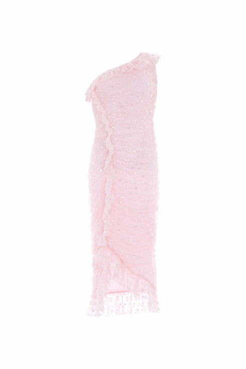 The Dotty Ruched Gloss One Shoulder Ballerina Dress in Peony Pink. This ballerina dress is adorned with scattering sequins throughout, adding an all over romantic shimmering effect. The outside shell of this dress is created in our signature soft tulle. Gently gathered and perfectly engineered around the body to create the most flattering bodycon silhouette. The lining of this style in made in stretch power mesh, enabling a figure-hugging shape with ultimate comfort and fit. Contours to the body and hugs in all the right places