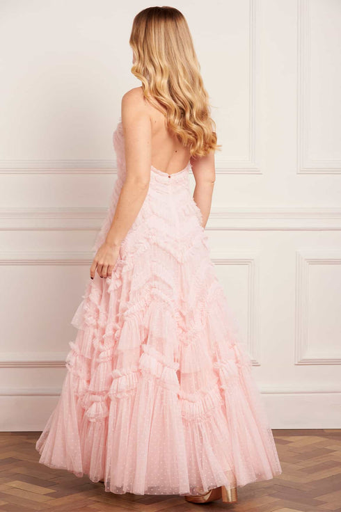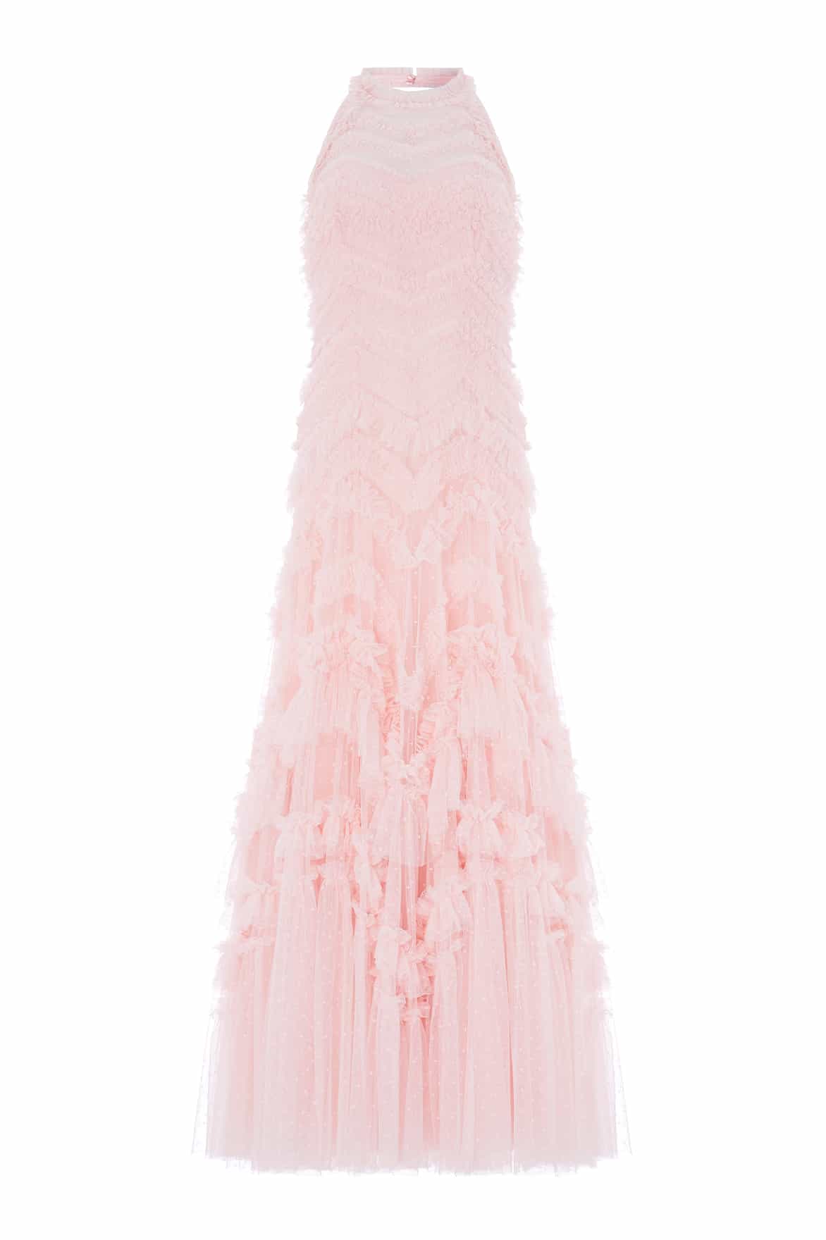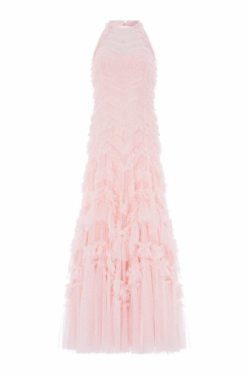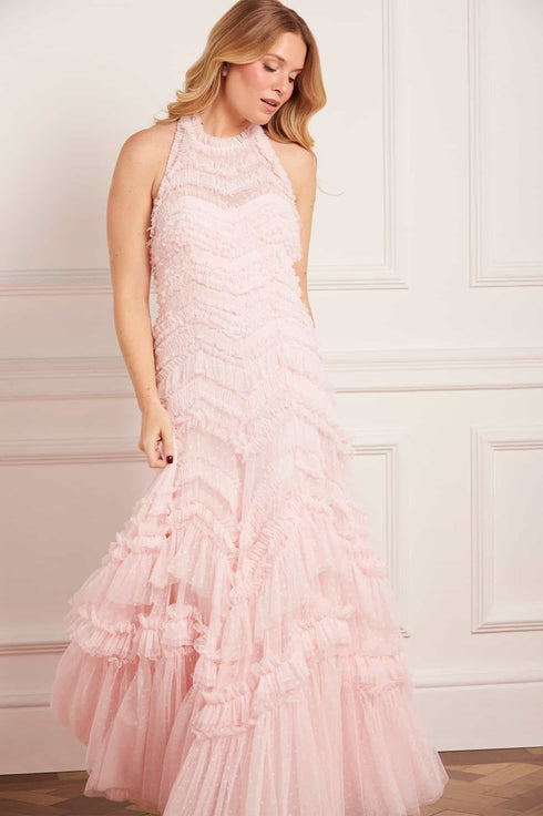NEW SEASON. The Elia Halter-Neck Gown in Seashell. A modern classic, designed with a flattering halter neckline and wide sash tie at the back. Crafted from layers of soft tulle, this gown drapes beautifully for an understated yet captivating evening look.