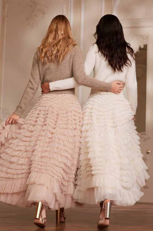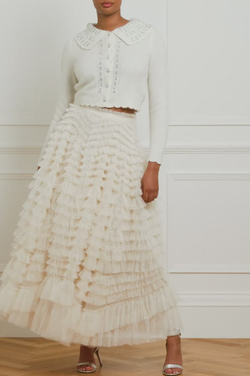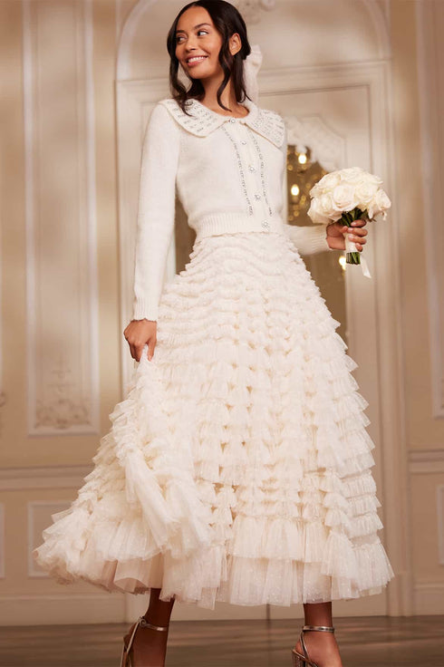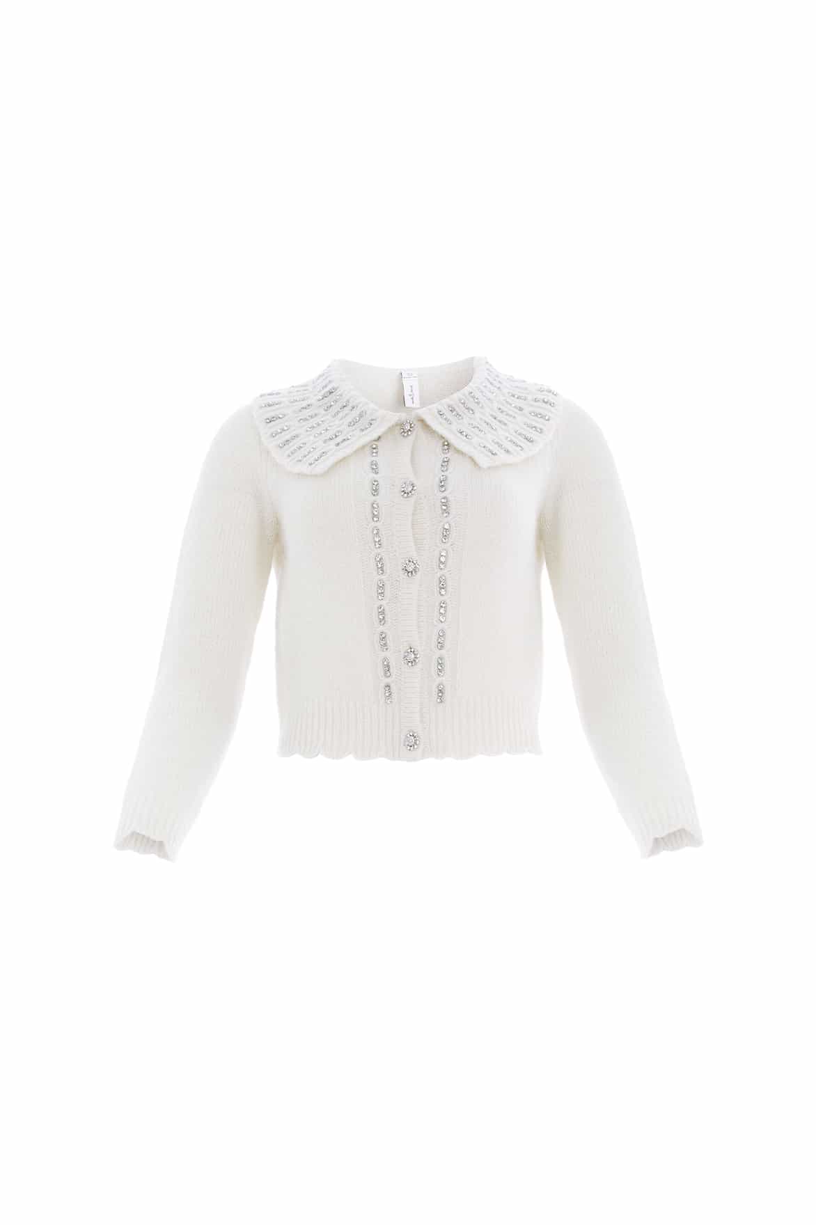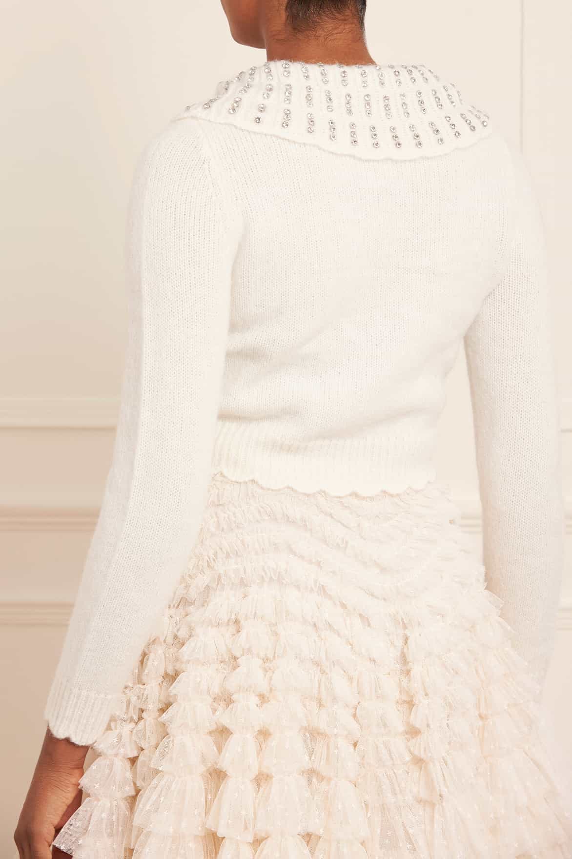 The Embellished Collar Short Cardigan in Cream. This embellished cardigan is developed from alpaca yarn, creating a soft, fluffy texture. Designed with a short silhouette, slim fit sleeves and signature Needle & Thread scallop detailing on the cuff and hem. This pretty style is beautifully crafted with diamante jewel buttons, a bib-neck collar and framed with crystal gems for a feminine look. This elegant style is a new season favourite.
