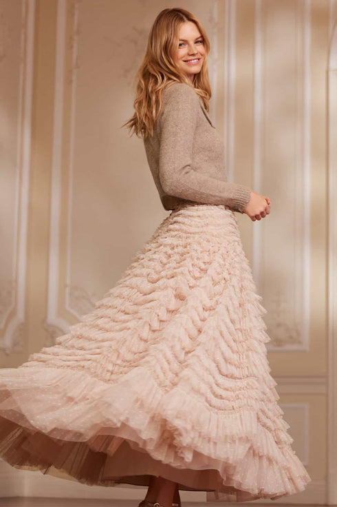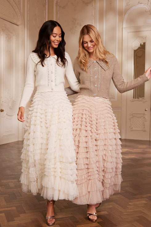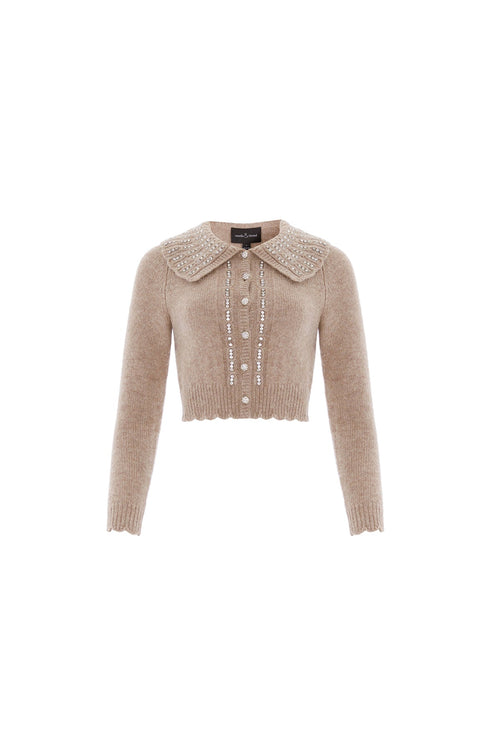 The Embellished Collar Short Cardigan in Pebble. This embellished cardigan is developed from alpaca yarn, creating a soft, fluffy texture. Designed with a short silhouette, slim fit sleeves and signature Needle & Thread scallop detailing on the cuff and hem. This pretty style is beautifully crafted with diamante jewel buttons, a bib-neck collar and framed with crystal gems for a feminine look. This elegant style is a new season favourite.