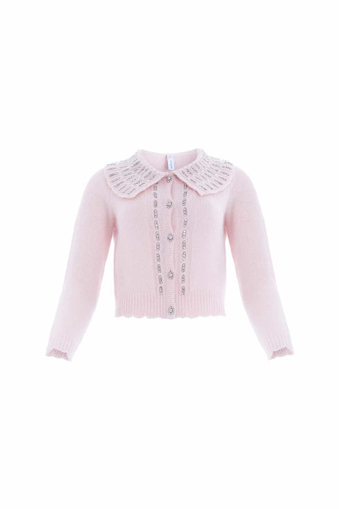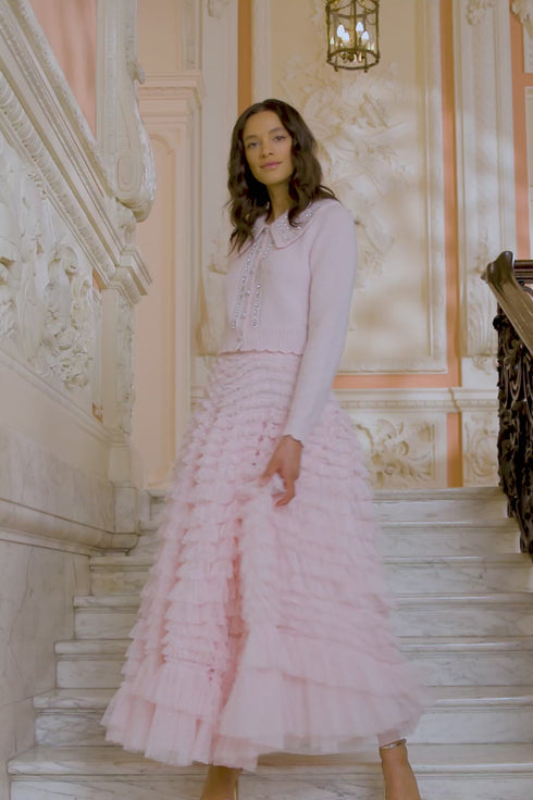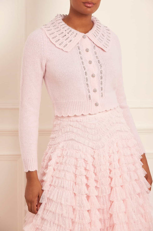 The Embellished Collar Short Cardigan in Peony Pink. This embellished cardigan is developed from alpaca yarn, creating a soft, fluffy texture. Designed with a short silhouette, slim fit sleeves and signature Needle & Thread scallop detailing on the cuff and hem. This pretty style is beautifully crafted with diamante jewel buttons, a bib-neck collar and framed with crystal gems for a feminine look. This elegant style is a new season favourite.