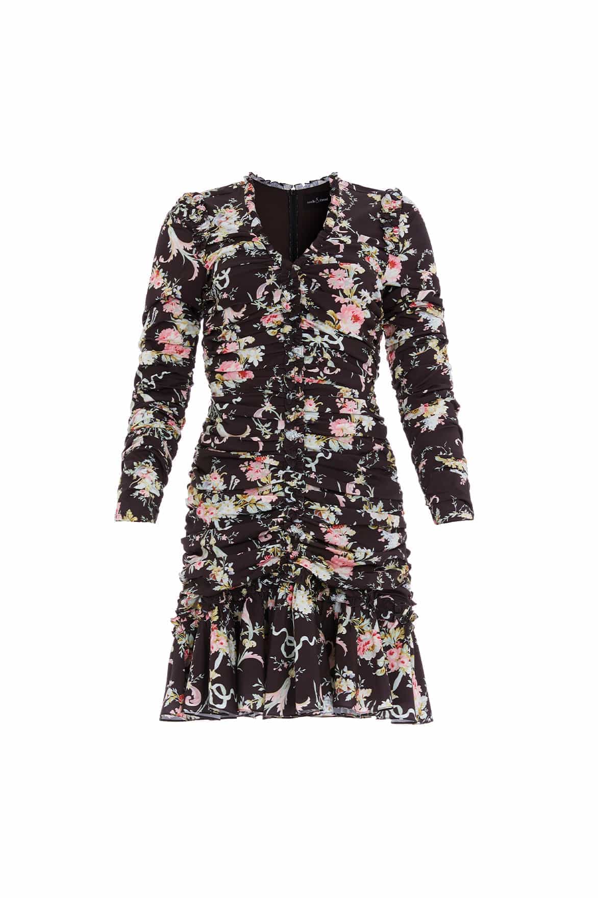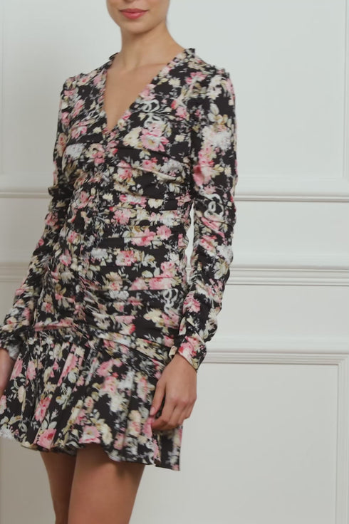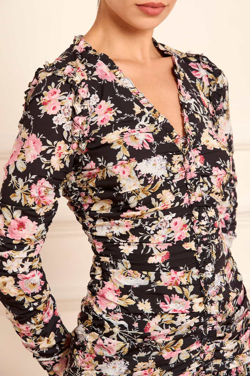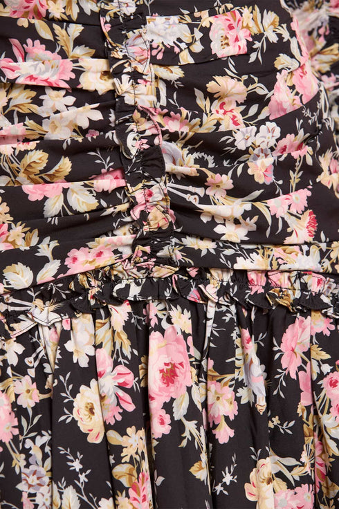The Enchanted Garden Ellen Crepe Micro Mini Dress in Graphite. A signature Needle & Thread print inspired by an archival hand-painted wallpaper design. This exquisite artwork brings to life a vision of romantic garden florals and historical motifs, beautifully translating the past into contemporary fashion. Crafted from crepe fabric with a touch of stretch, this gown offers a flattering fit that gracefully contours the body. The softly gathered bodice and slim sleeves add a romantic touch, creating a silhouette that is both feminine and sophisticated. The V-neckline, adorned with delicate signature frills, enhances the gown's charm, making it a perfect choice for any occasion.