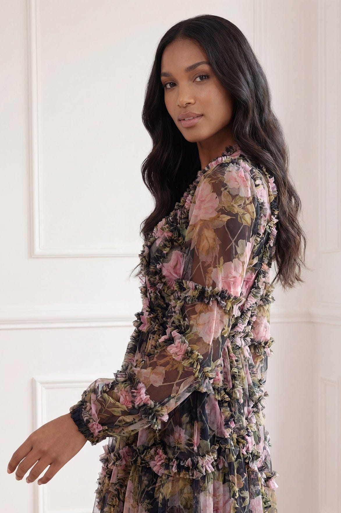 - Floral printed tulle decorated with printed tulle frills across the bodice, skirt and sleeve