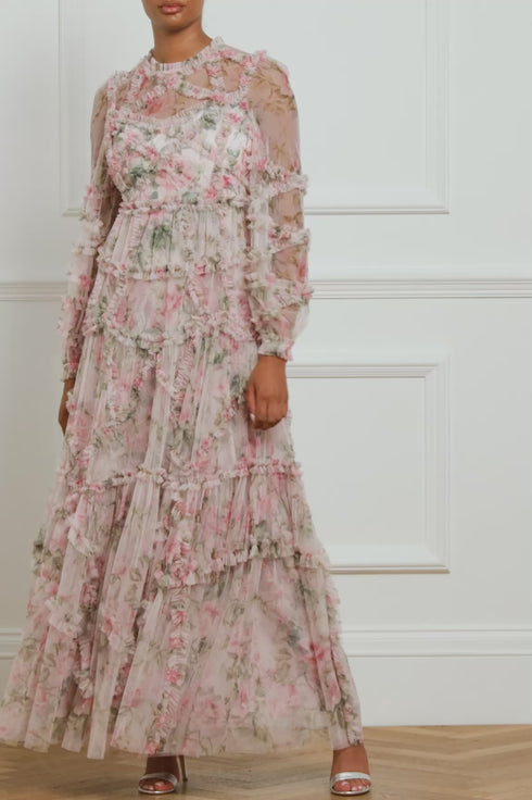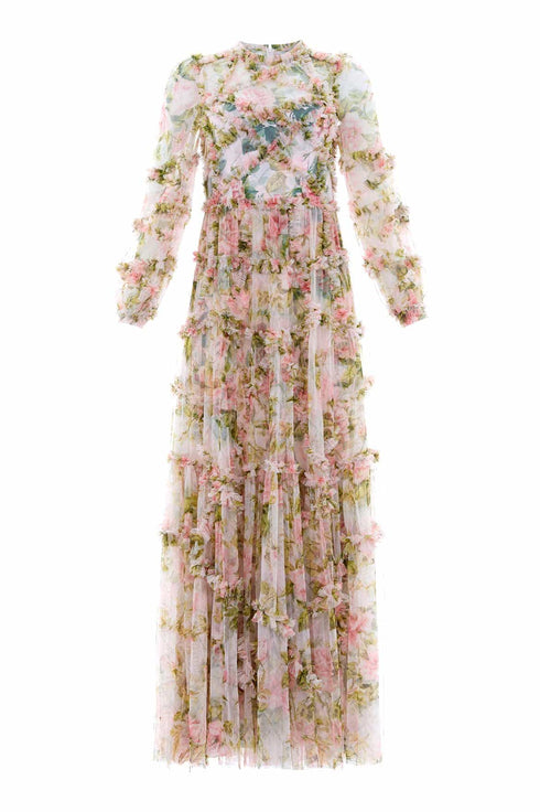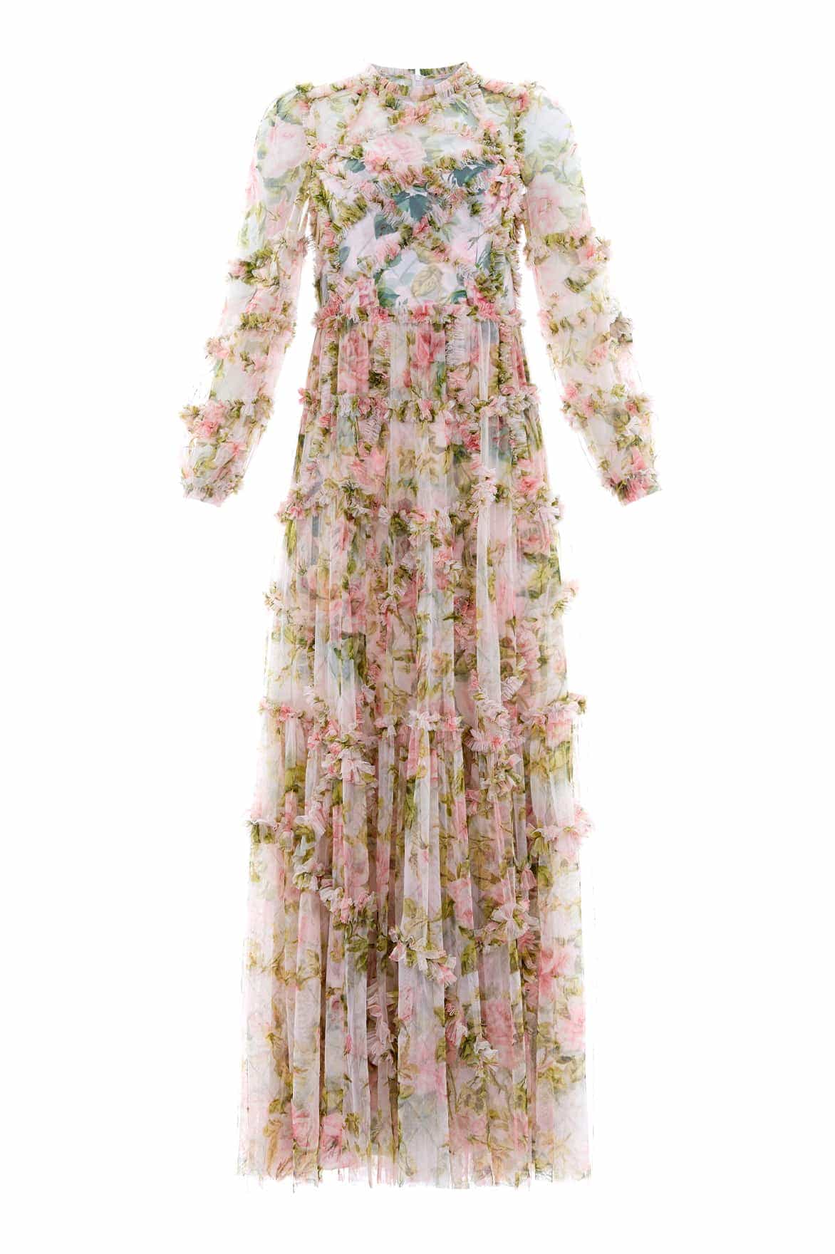 The English Rose Diamond Ruffle Gown in Sky Pink. This gown is inspired by a traditional rose print taken from a 1900s hand-painted artwork, in soft hues of deep pinks. Developed with signature Needle & Thread styling featuring perfectly engineered frills for all-over delicate texture. The perfect gown to take you from dinner to the dancefloor.