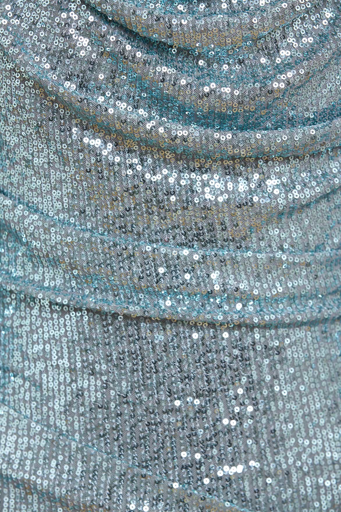 The Erin Long Sleeve Gown in Thistle Blue. This gown exudes timeless Hollywood glamour. This gown is meticulously crafted through draping to achieve perfectly positioned pleats and folds for a flattering shape. The elegant cowl neckline is adorned with countless glittering sequins, while the slim silhouette gently drapes across the body. A fluid, sweeping skirt adds movement, complementing the slim long sleeves. The gown is made from a specially developed fabric featuring sequins, delicately stitched onto a stretch mesh base, creating a shimmering, all-over effect for a truly radiant look.