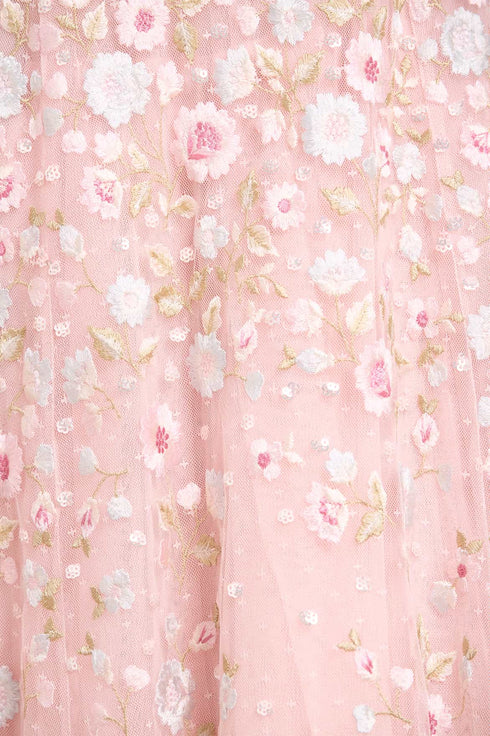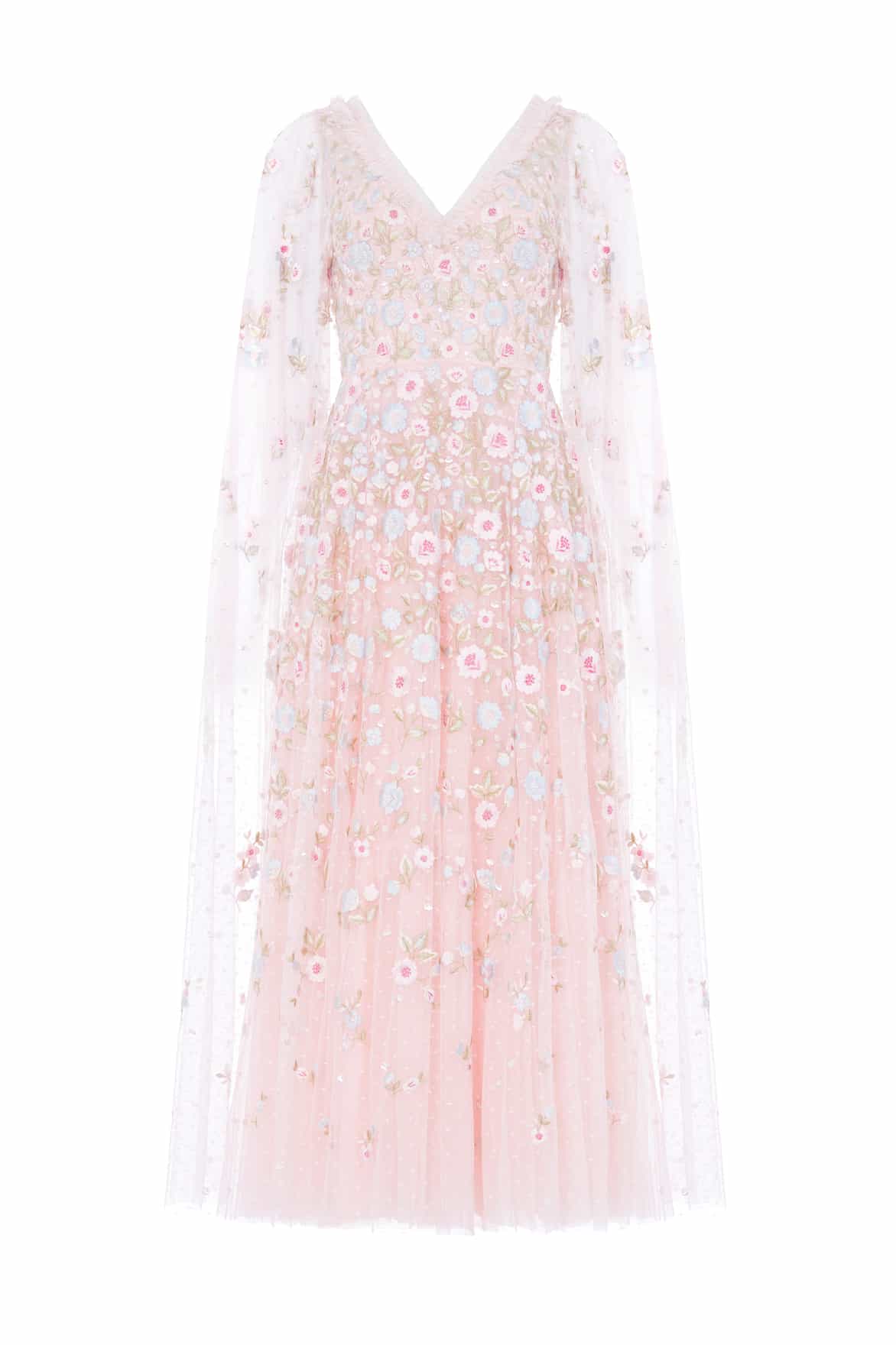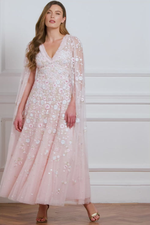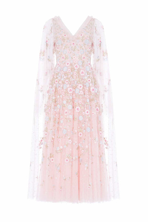 NEW SEASON. The Ethereal Blooms Cape Sleeve Ankle Gown in Seashell/Multi. Embellished with trailing floral embroidery inspired by early 1900s archive prints. Designed with ethereal cape sleeves and a softly flared tulle skirt, it creates a beautifully light and romantic impression.