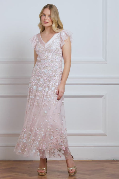 NEW SEASON. The Ethereal Blooms Short Sleeve Ankle Gown in Seashell/Multi. Showcases exquisite trailing floral embroidery in soft pastel tones. Cut with a fitted bodice and gentle A-line skirt, the design creates a light and romantic impression, perfect for evening occasions.