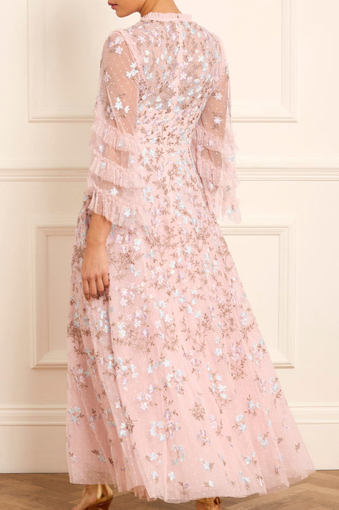 The Everett Bloom Round Neck Ankle Gown in Dusk Pink/Multi. This beautiful gown features exquisite, embroidered artwork inspired by a vintage archive print that showcases floating florals. Beautifully decorated with floral clusters cascading gently toward the hem, enhancing the romantic charm. Designed with fluted sleeves adorned with frothy tulle ruffles and embroidered floral motifs, while the neckline, shoulders, and cuffs feature signature Needle & Thread tulle frills for a touch of romantic elegance. The skirt is composed of generous layers of net and tulle, culminating in a sweeping hemline that adds to the gown's enchanting allure.