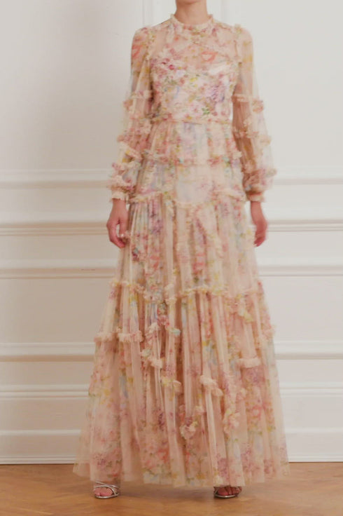 - Floral printed tulle decorated with printed tulle frills across bodice, skirt and sleeves