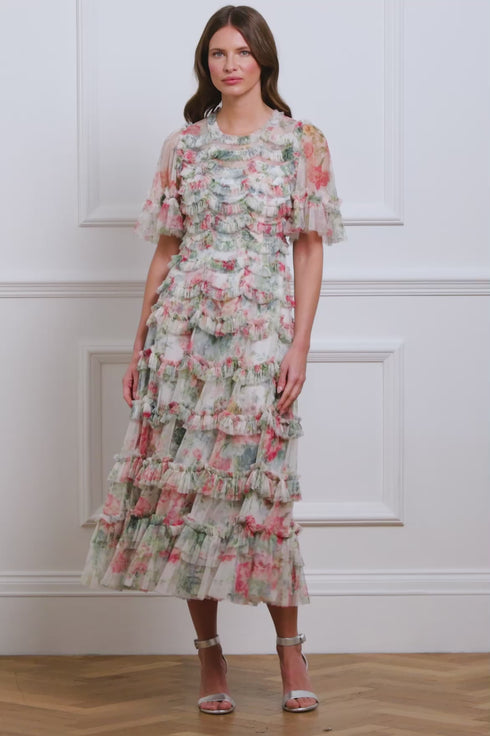 The Floral Romance Round Neck Ballerina Dress in Moonshine features a captivating print from an archival collection, showcasing hand-painted floral artwork from the early 1900s with a delicate watercolour effect. Inspired by Victorian design, the dress is elegantly detailed with meticulously placed ruffles. Crafted from signature Needle & Thread soft tulle, it exudes a romantic charm. The skirt gracefully skims the body, gently flaring to create beautiful movement, enhancing the gown’s refined, ethereal appeal.