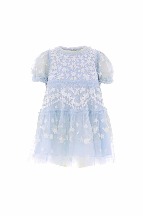 The Garland Ribbon Baby Dress in Dusk Blue/Cream. This charming dress features Victorian lace-inspired embroidery with pastel floral motifs. Delicate ruffled puff sleeves and frills at the neckline and shoulders add a sweet touch. The gathered skirt hem is finished with a playful frill for added volume. Lined in soft cotton voile for comfort, the set includes matching cotton dobby bloomers with frilled edges. The perfect dress for your little one’s upcoming special occasion.