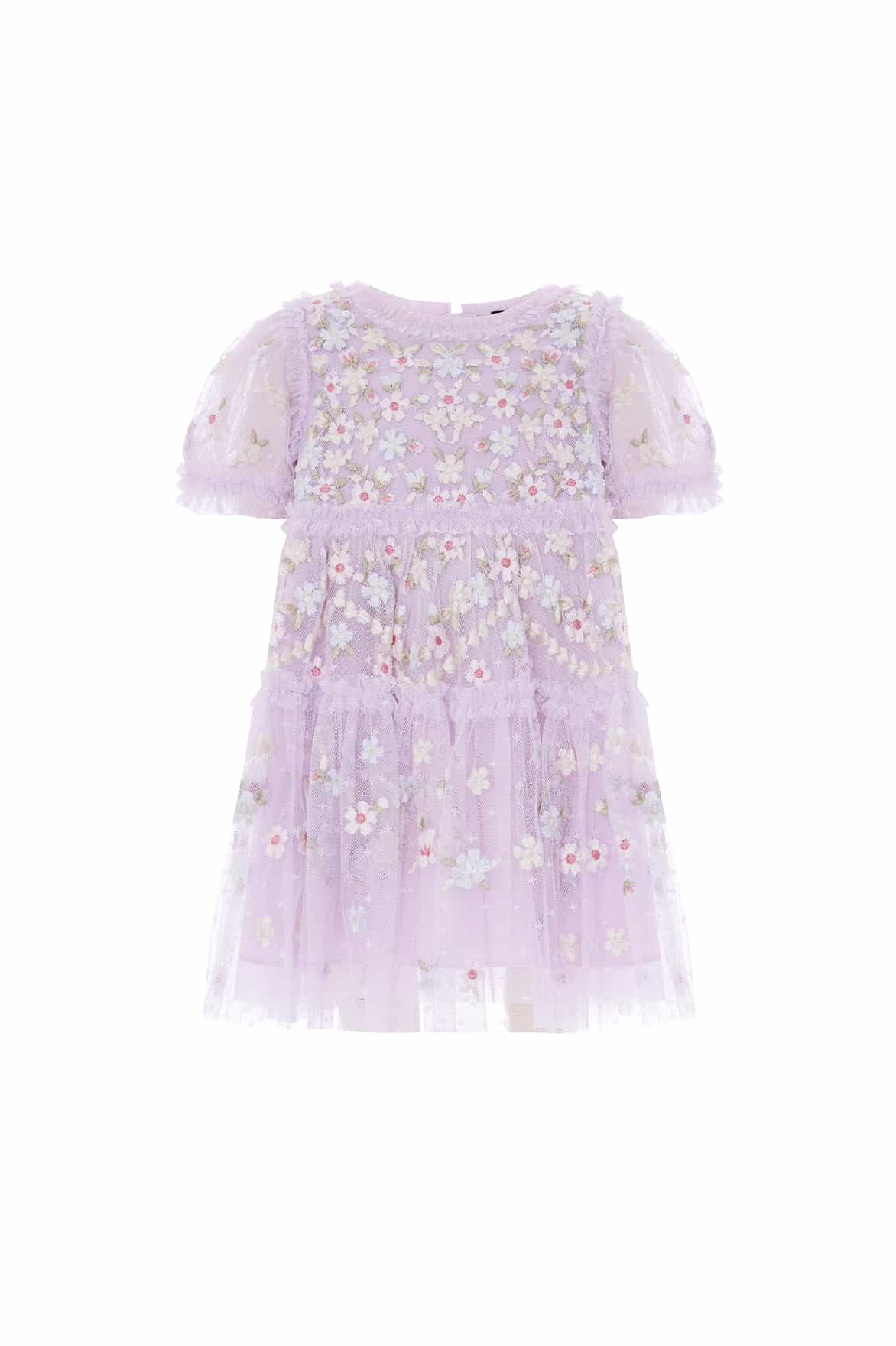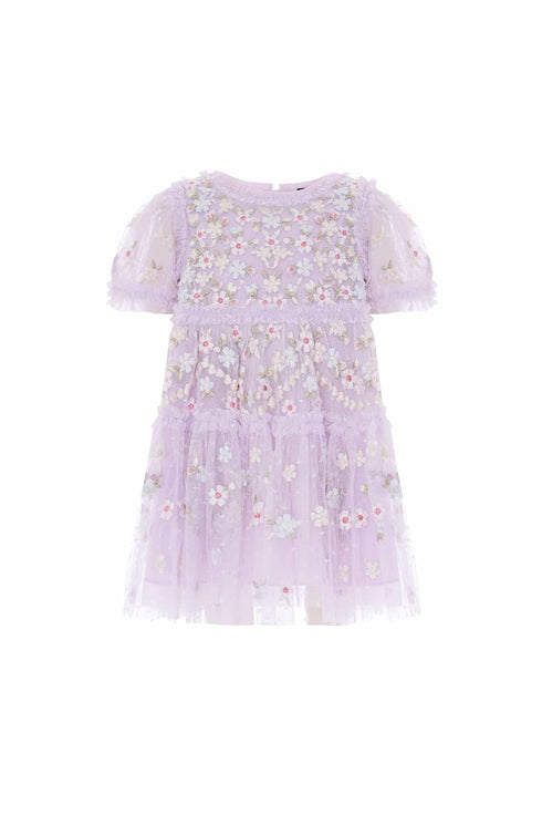 NEW SEASON. The Garland Ribbon Baby Dress in Lilac Pearl/Pastel. Features pastel-toned ribbon embroidery and a softly flared silhouette. Designed for comfort and sweetness, it’s a beautiful piece for celebrations.