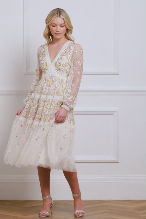 NEEDLE & THREAD EXCLUSIVE. The Garland Ribbon Midaxi Dress in Cream/Yellow features floral embroidery in soft pastel tones, inspired by Victorian lace trims. The V-shaped waist seam creates a flattering, effortless fit, while intricate lace trims add signature Needle & Thread detailing. An effortlessly timeless and elegant style.