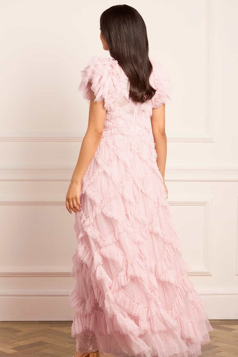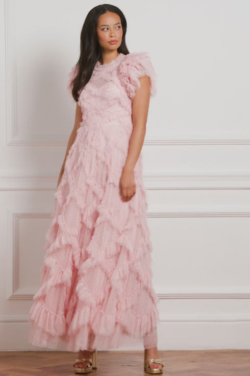NEEDLE & THREAD EXCLUSIVE. The Genevieve Rose Gown in Ballerina Pink. This statement gown is inspired by 1930s Hollywood glamour. Beautifully designed with diamond tulle details and trims. Crafted with multiple layers of ruffled, frothy tulle sculpted for dramatic effect. Make the ultimate style statement this season.