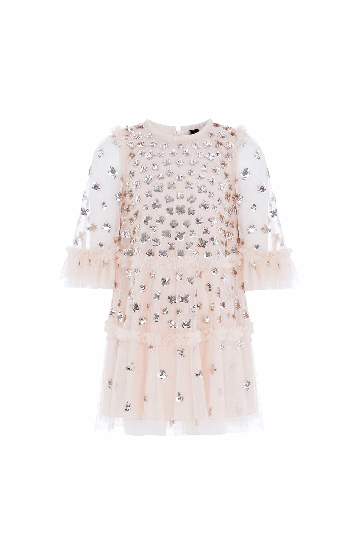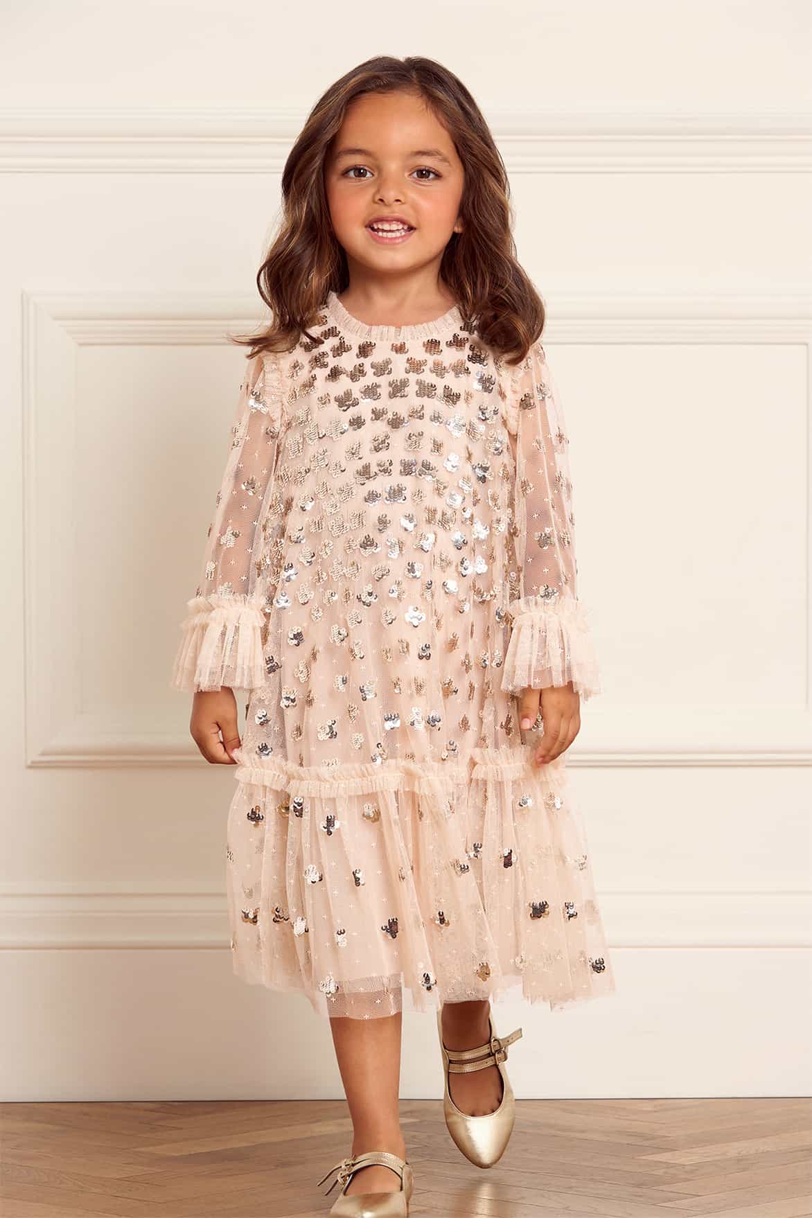The Glisten KIDS Dress in Dust Beige/Silver. This dress is beautifully adorned with shimmering sequin motifs. Designed with loose-fit, fluted sleeves, and frill cuffs decorated with scattered sequins. Developed with signature Needle & Thread soft tulle ruffles at the neckline and shoulders add a fun, frothy texture. The skirt features generous layers of net and tulle with a sweeping hemline, perfect for twirling. The perfect dress for your little one's upcoming occasions.