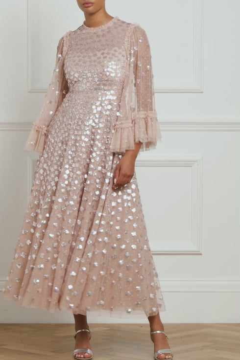 The Glisten Long Sleeve Ankle Gown in Rose Gold. This ethereal gown is adorned with shimmering sequin motifs that scatter towards the hem. Crafted with romantic fluted bracelet-length sleeves with frill cuffs, decorated with scattered sequin motifs. Beautifully trimmed with signature Needle & Thread soft tulle ruffles at the neckline and shoulder adds to the romantic styling. The skirt is composed of generous layers of net and tulle for a sweeping hemline. A statement piece you'll forever treasure.