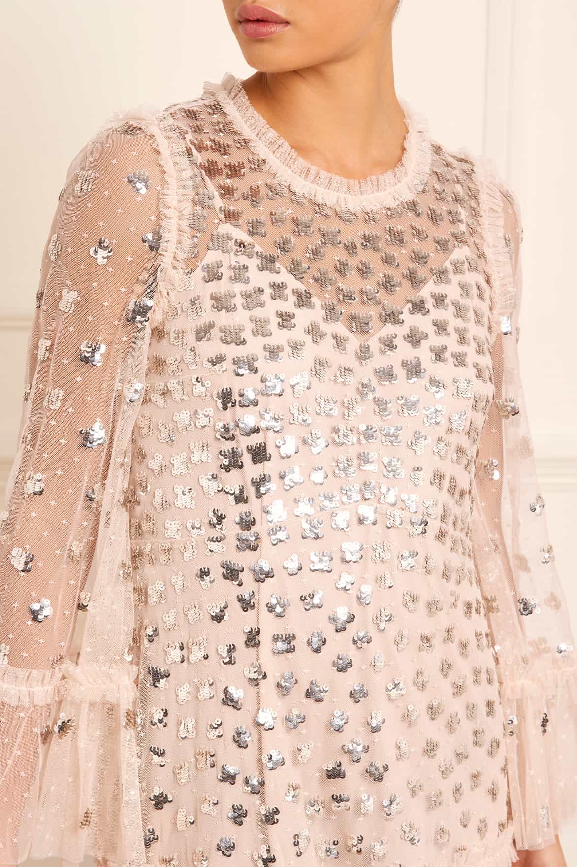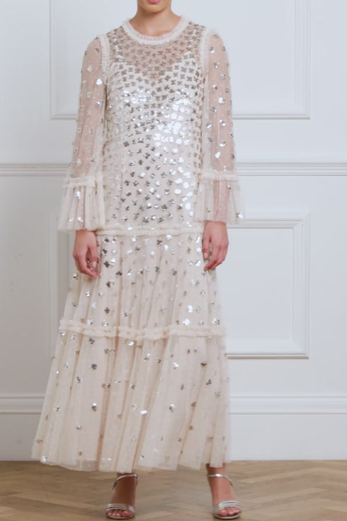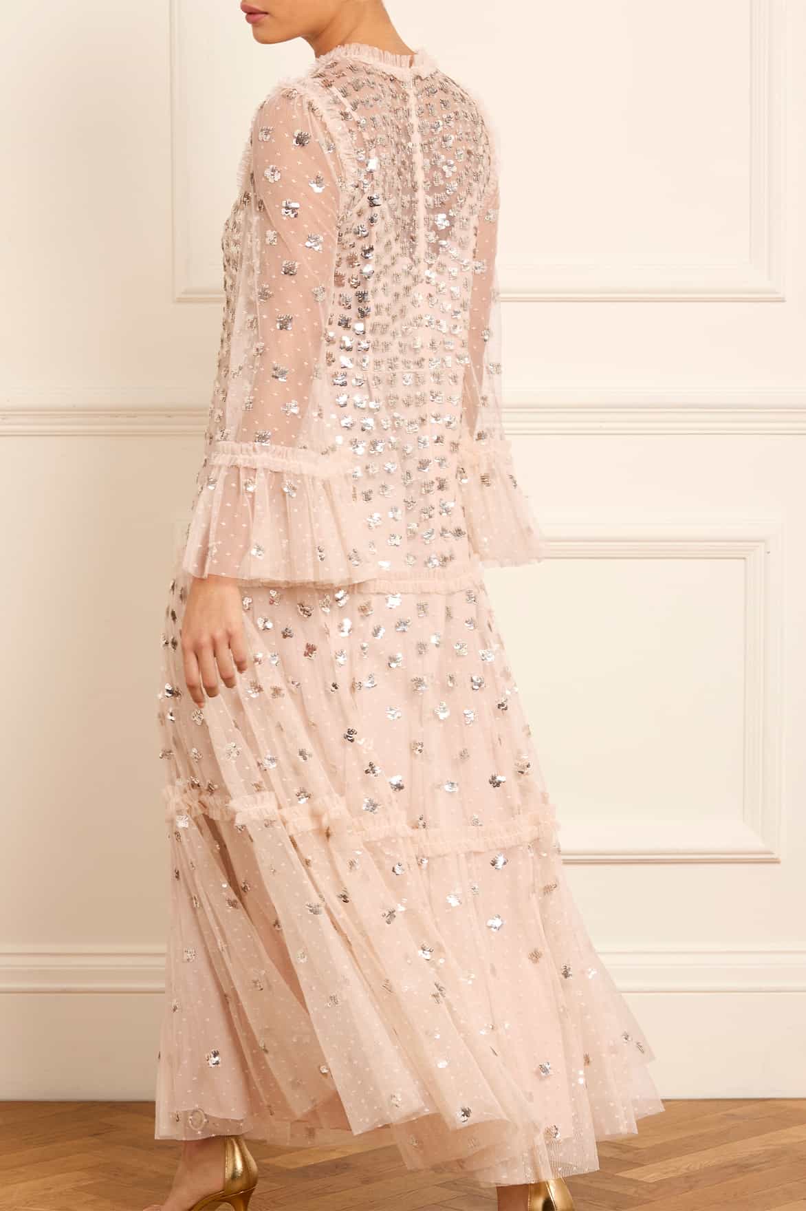 The Glisten Tiered Ankle Gown in Dust Beige / Silver. Beautifully adorned with shimmering sequin motifs that scatter towards the hem, this ethereal style features a loose, flattering fit and flowing shape for ease of wear. Designed with romantic fluted bracelet-length sleeves with frill cuffs decorated with scattered sequin motifs. The skirt is developed from layers of signature Needle & Thread soft tulle for a touch of romantic styling.