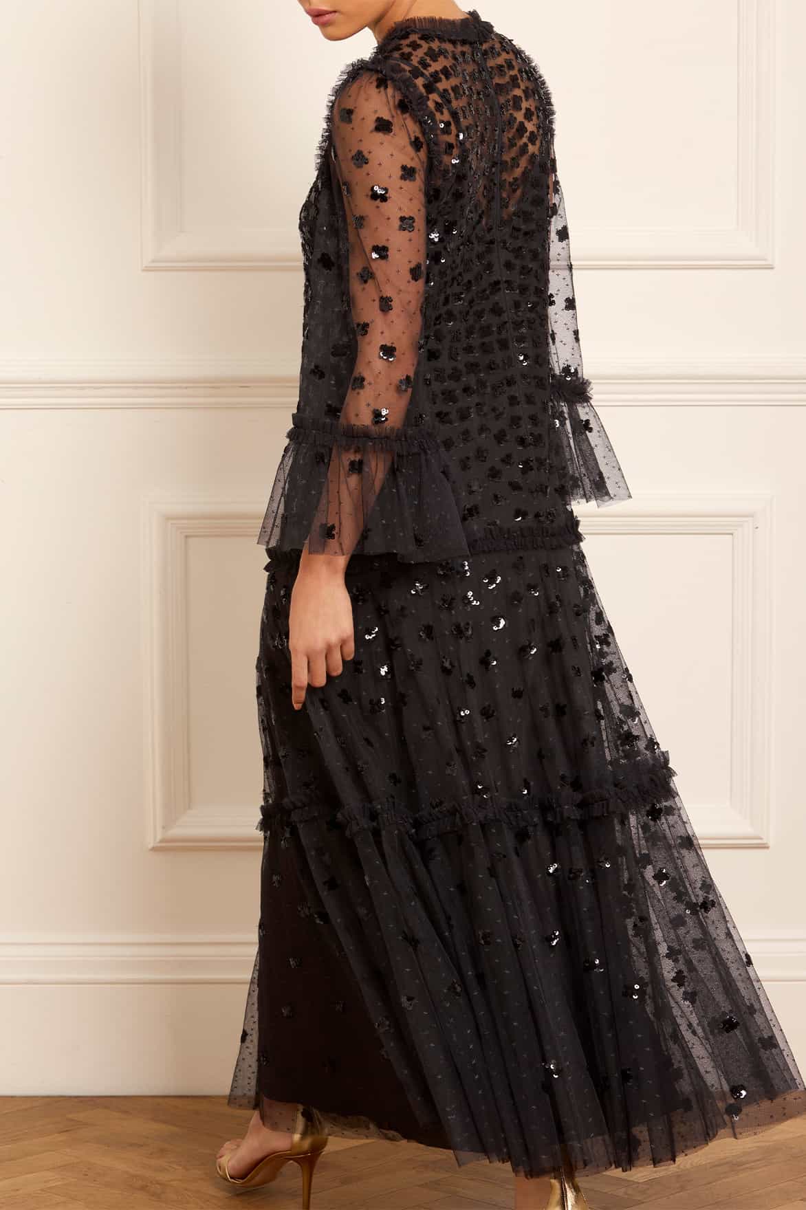 - Semi-fitted through the bust with a relaxed fit through the waist and hips. Full multi-layered skirt.