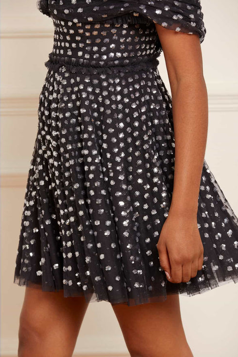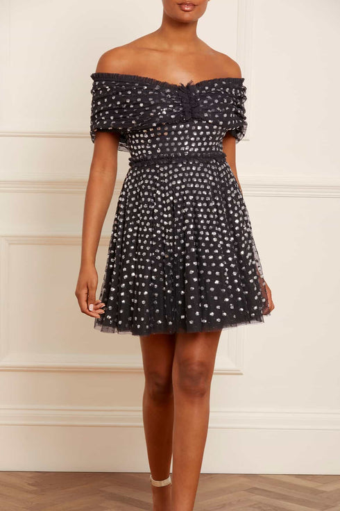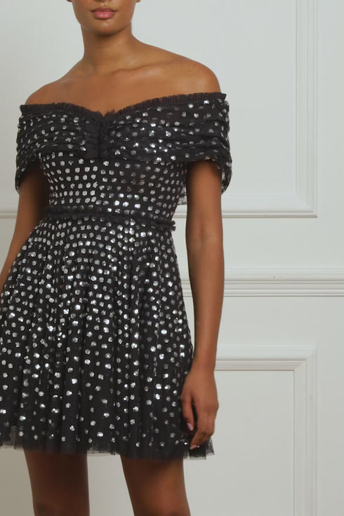 The Grace Gloss Off-Shoulder Micro Mini Dress in Graphite / Silver. This dress is beautifully decorated with high-shine sequins in dot motifs creating an enchanting, shimmery effect. Crafted with an off-the-shoulder design inspired by iconic Grace Kelly, capturing the elegance of her look perfectly. Designed with an integrated corset for the perfect shape and structure. You'll forever treasure the Grace Gloss.