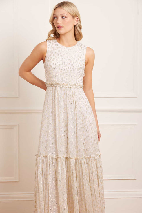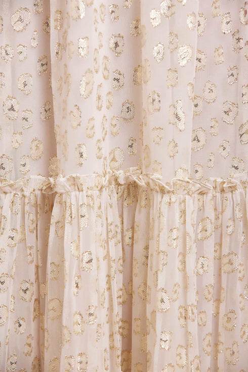 The Harper Lurex Cape Ankle Gown in Cream. Crafted in luxurious glittering gold lurex georgette fabric, this gown features a delicate, subtle leopard print motif that adds an understated touch of drama. The dramatic cape, with a detachable fastening, offers versatile styling options, while the soft chiffon creates a romantic, flowing silhouette. Perfect for transitioning seamlessly from day to night.