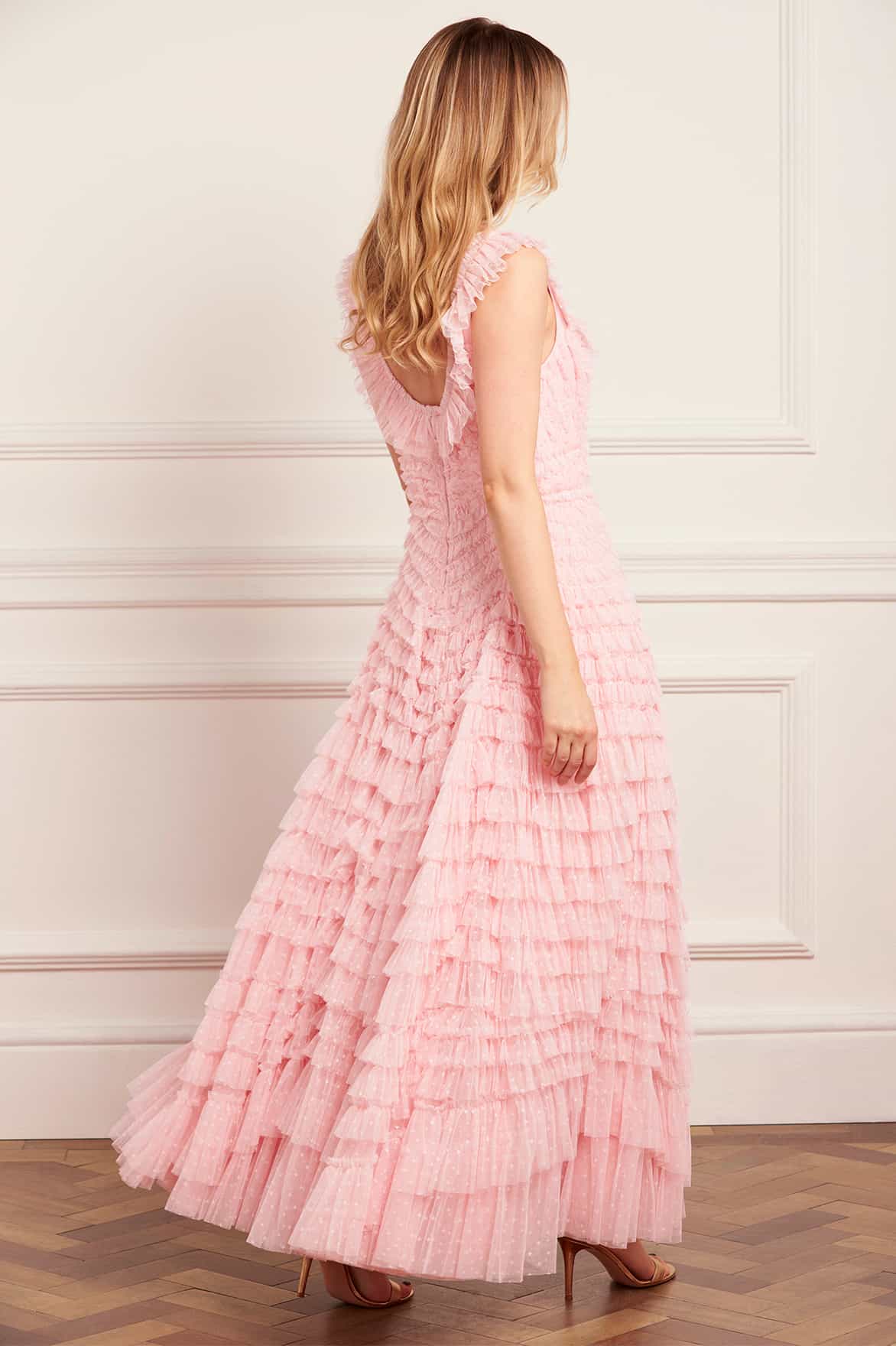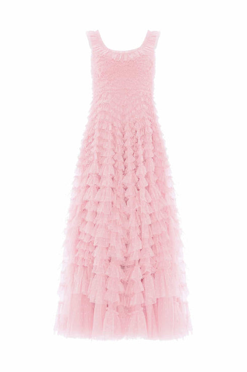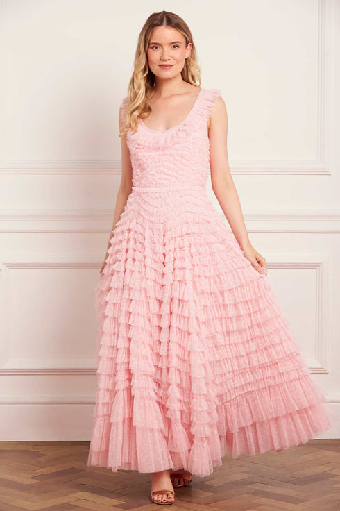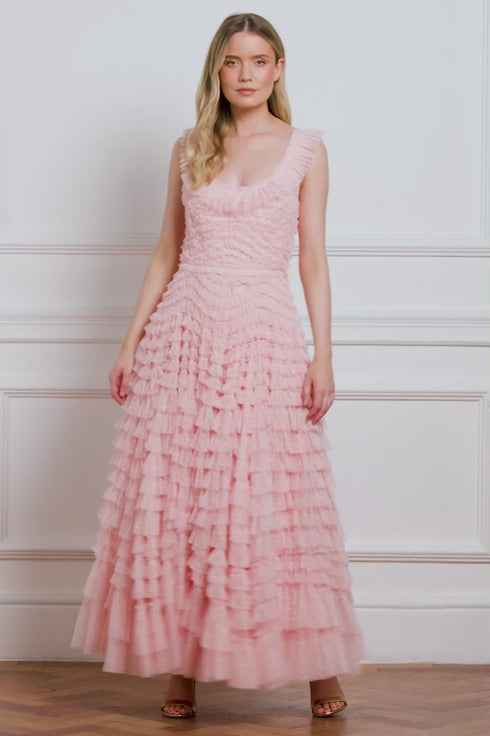 NEW SEASON. The Hattie Scoop Neck Ankle Gown in Appleblossom. A timeless silhouette crafted from airy tulle. Featuring a soft scoop neckline and full layered skirt, this gown exudes romantic charm and effortless grace in a fresh, spring hue.