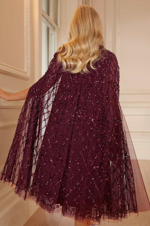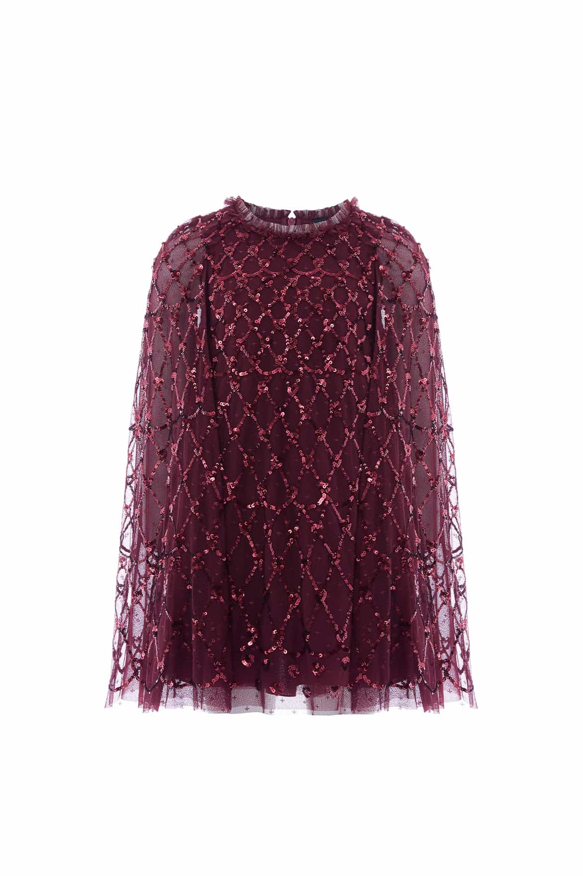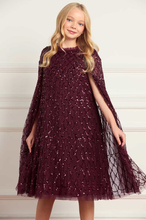 NEW SEASON. The Heart Lattice Cape Kids Dress in Claret. A romantic design, inspired by Victorian artistry in the Bright Star collection. Embroidered heart motifs are arranged in a lattice pattern across layers of soft tulle, while cape-style sleeves add a magical, fairy-tale detail. The rich claret shade is perfect for festive events. Pair with the Heart Lattice Ankle Gown in Claret from the womenswear range for picture-perfect matching.