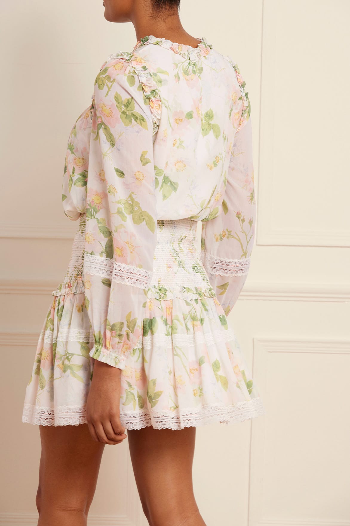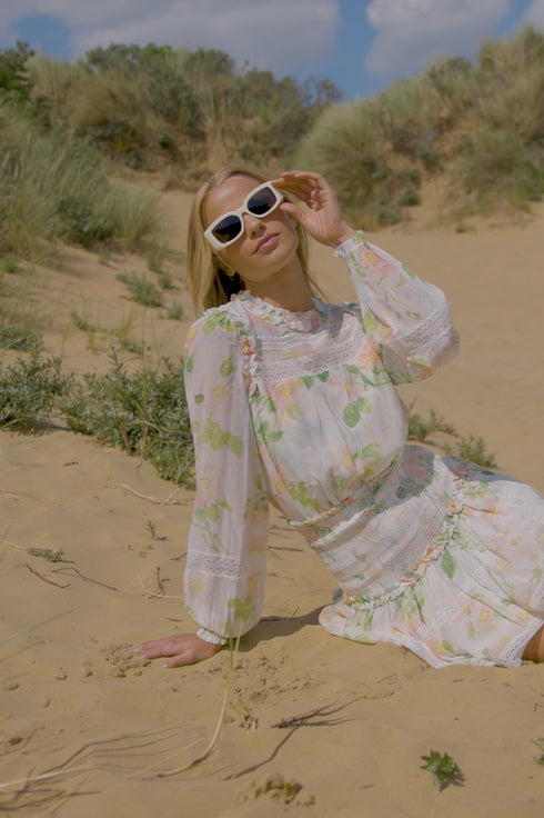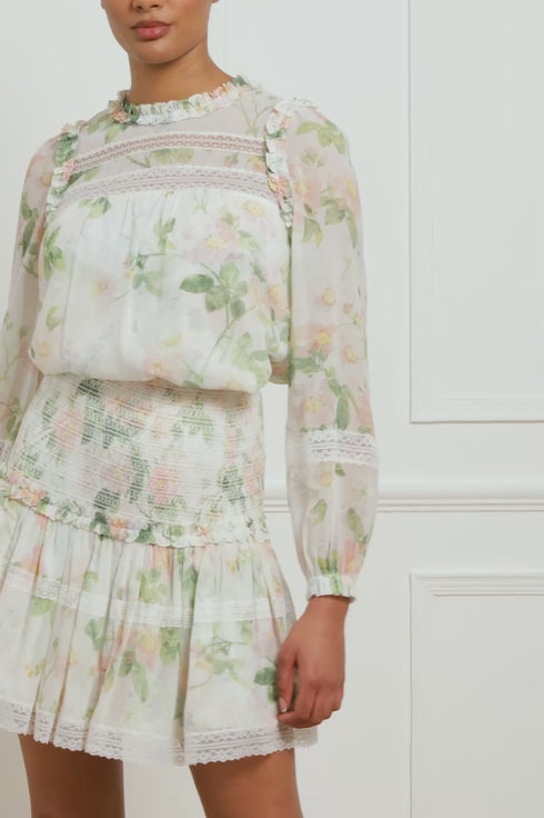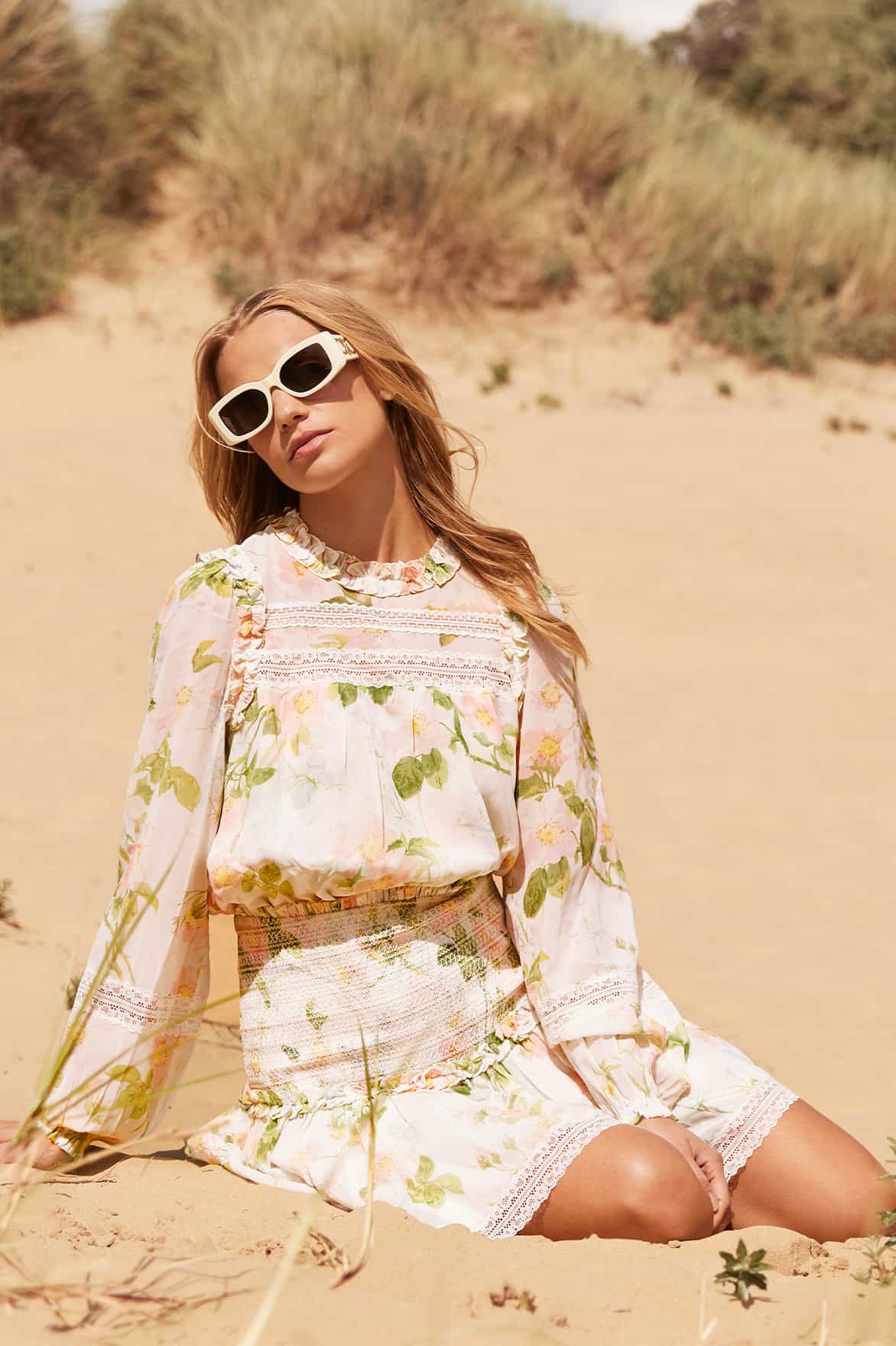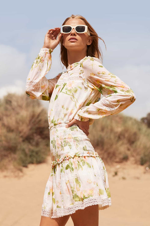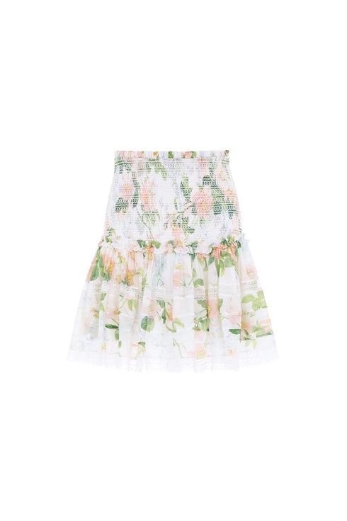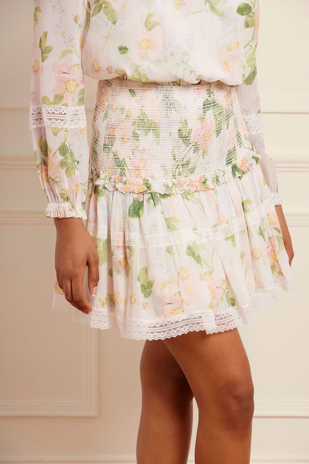 The Immortal Rose Poppy Smocked Micro Mini Skirt in Moonshine. This beautiful micro mini skirt features a romantic print captured from an antique, hand-painted artwork from the early 1900s. Decorated with wild rose motifs in soft pink shades intertwined with green foliage. This mini skirt is inspired by Victorian garments featuring a soft, elasticated smocked waistband with embroidery stitching. Developed in our soft semi-sheer chiffon fabric and adorned with lace trims for a playful, summer look. We recommend styling it with the Immortal Rose Poppy Chiffon Top for the full look.