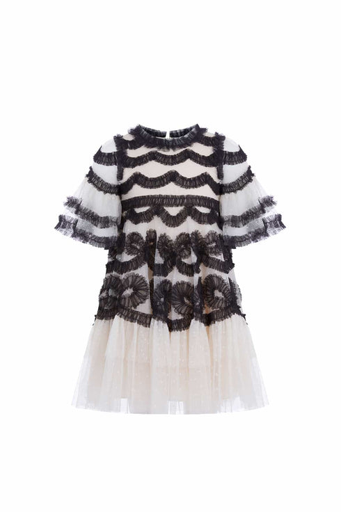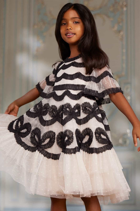 The Ingrid KIDS Dress in Cream / Graphite. This statement dress is designed in signature Needle & Thread textile, inspired by ribbon bows, using delicate tulle and subtle texture to capture this signature motif. Beautifully crafted with a round neckline and floaty sleeves. An iconic wardrobe staple.