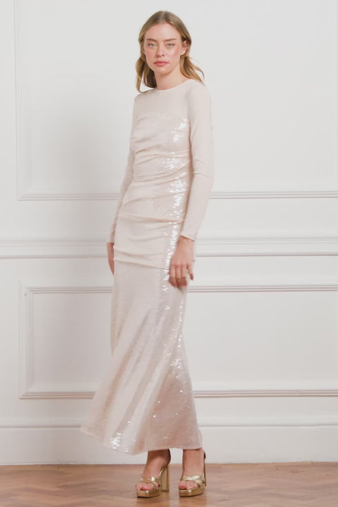 NEW SEASON. The Josephine Long Sleeve Gown in Oyster. Capturing the collection’s celestial shimmer, as if bathed in moonlight. Thousands of sequins are delicately stitched onto stretch mesh, creating a glittering surface that shifts with movement, like starlight scattered across water. The fluid hemline and powermesh sleeves balance sparkle with softness, while the oyster tone offers timeless refinement. A gown that feels both modern and eternal.