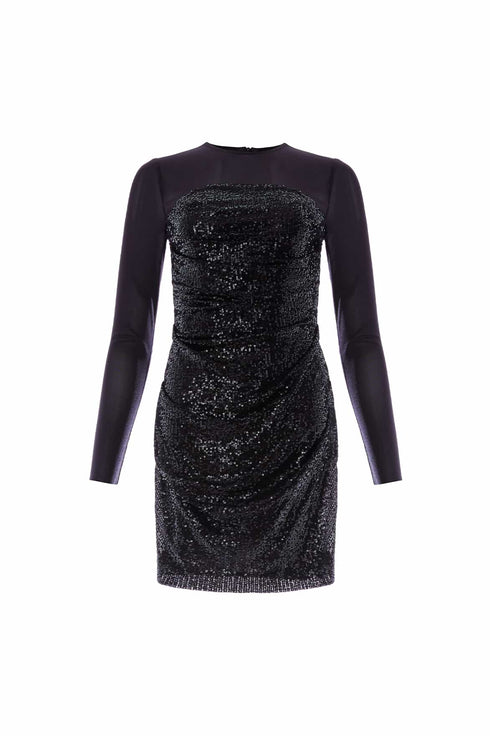 NEW SEASON. The Josephine Long Sleeve Micro Mini Dress in Graphite. Reimagining celestial glamour with youthful energy. This party piece is embellished with twinkling sequins like stardust, the slim silhouette is balanced by sheer powermesh sleeves. The mini length lends playful vibrancy, while the graphite tone grounds the design in Bright Star’s dramatic romance.