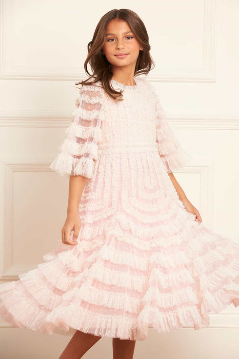 The La Vie En Rose Kids Dress in Dusk Pink/Cream. This pretty dress features delicate tulle ruffles, artfully arranged to enhance the silhouette. Contrast-coloured gathered tulle adds a soft, ethereal touch to the design. A timeless, graceful piece, perfect for all your little one's upcoming special events.