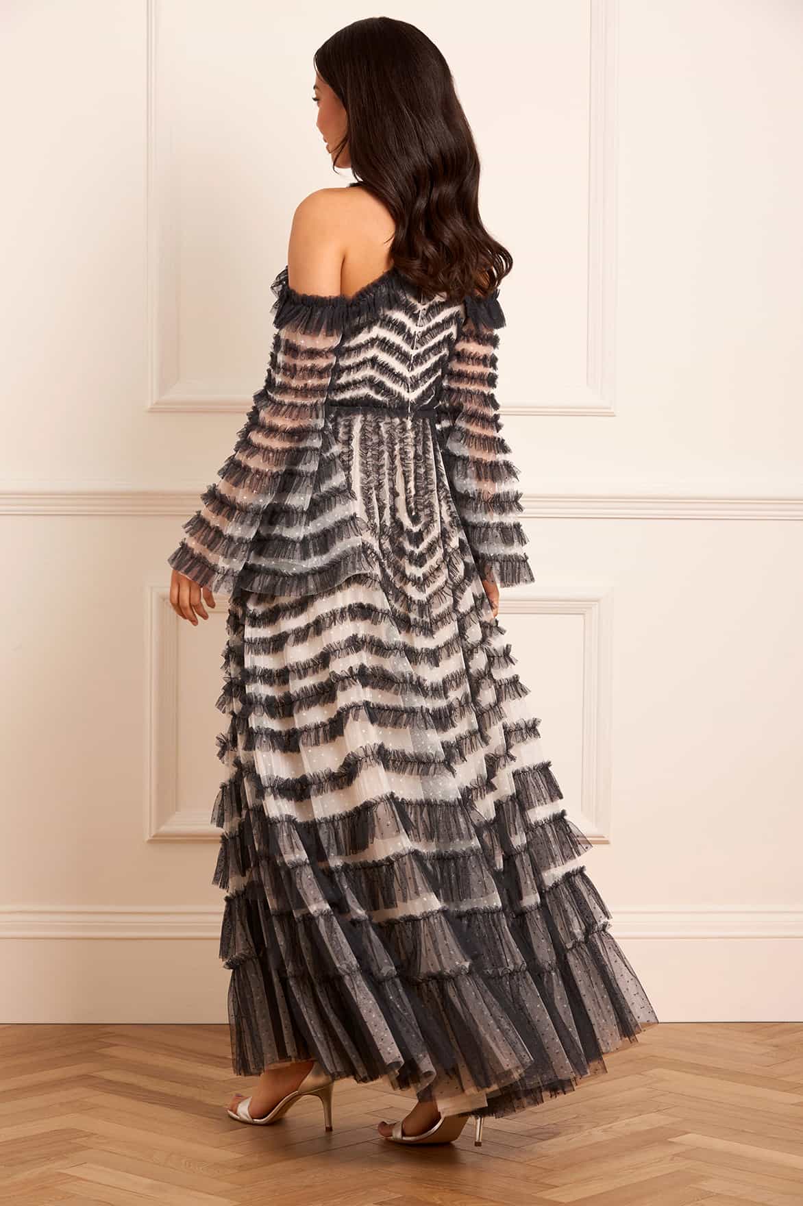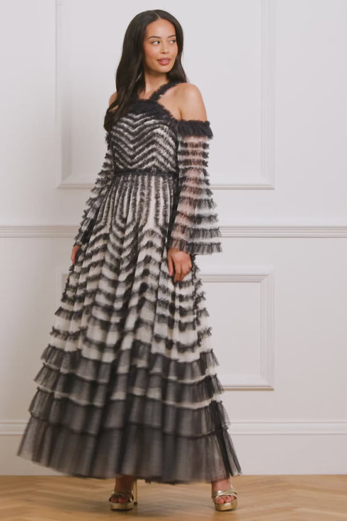 NEW SEASON | NEEDLE & THREAD EXCLUSIVE. The La Vie En Rose Off Shoulder Gown in Cream/Graphite. Designed with delicate ruffles cascading from the neckline down the panels, framed with contrast trims and gathered frills, the silhouette is soft and structured. A romantic and ethereal gown ideal for modern fairytale moments.
