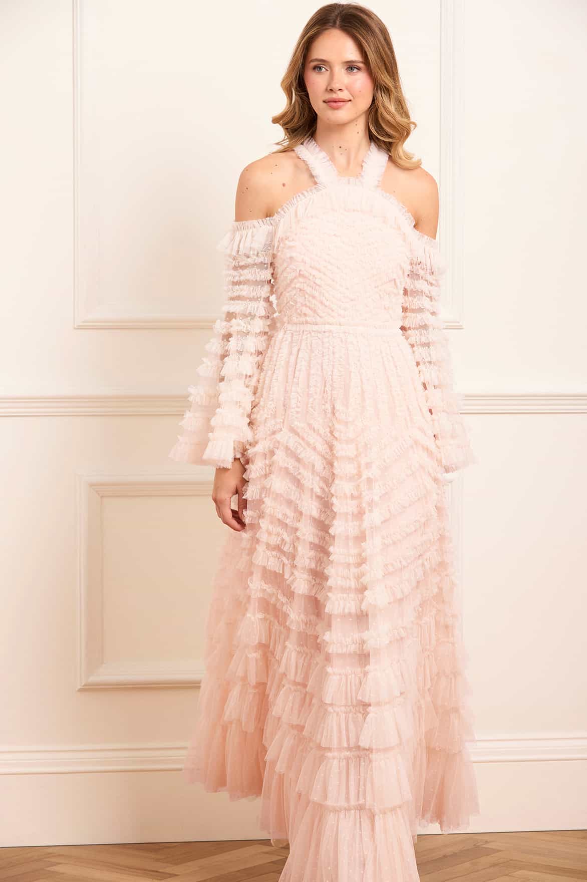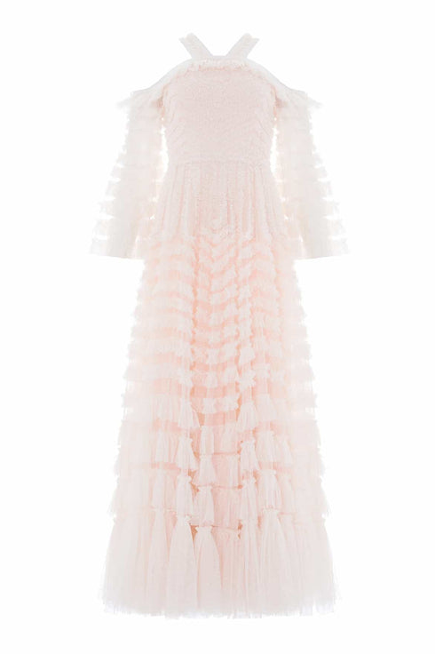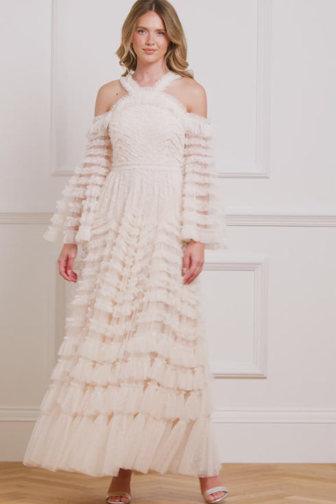 The La Vie En Rose Off-Shoulder Gown in Opal/Cream. Soft tulle ruffles and frothy gathered frills complement the figure with a flattering neckline and contouring silhouette, the graduated frill detailing adds texture and movement. A romantic option for unforgettable moments.