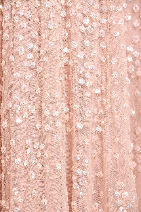 The Leila Dot V-Neck Ankle Gown in Pearl Pink is adorned with shimmering clustered dot motifs, creating a sparkling effect. This elegant V-neck gown features slim sleeves, with signature Needle & Thread tulle frills at the neckline and armholes. The skirt, crafted from layers of net and tulle, finishes with a sweeping hemline. A captivating design with dramatic flair.