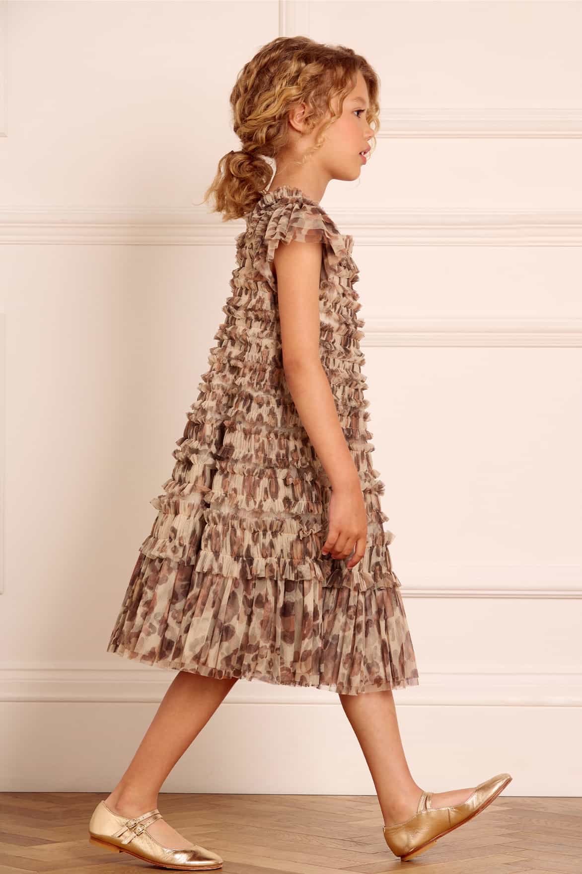 The Leopard Lisette Kids Dress in Moonshine. This statement print was hand-painted in-house using watercolour. Featuring soft leopard motifs that vary in scale with a watery definition. Crafted with a playful, frothy texture created using soft tulle panels gathered to create an all-over pretty effect. Designed with short sleeves and underlayers of tulle to create a generous volume skirt. The perfect dress for your little one's upcoming occasions.