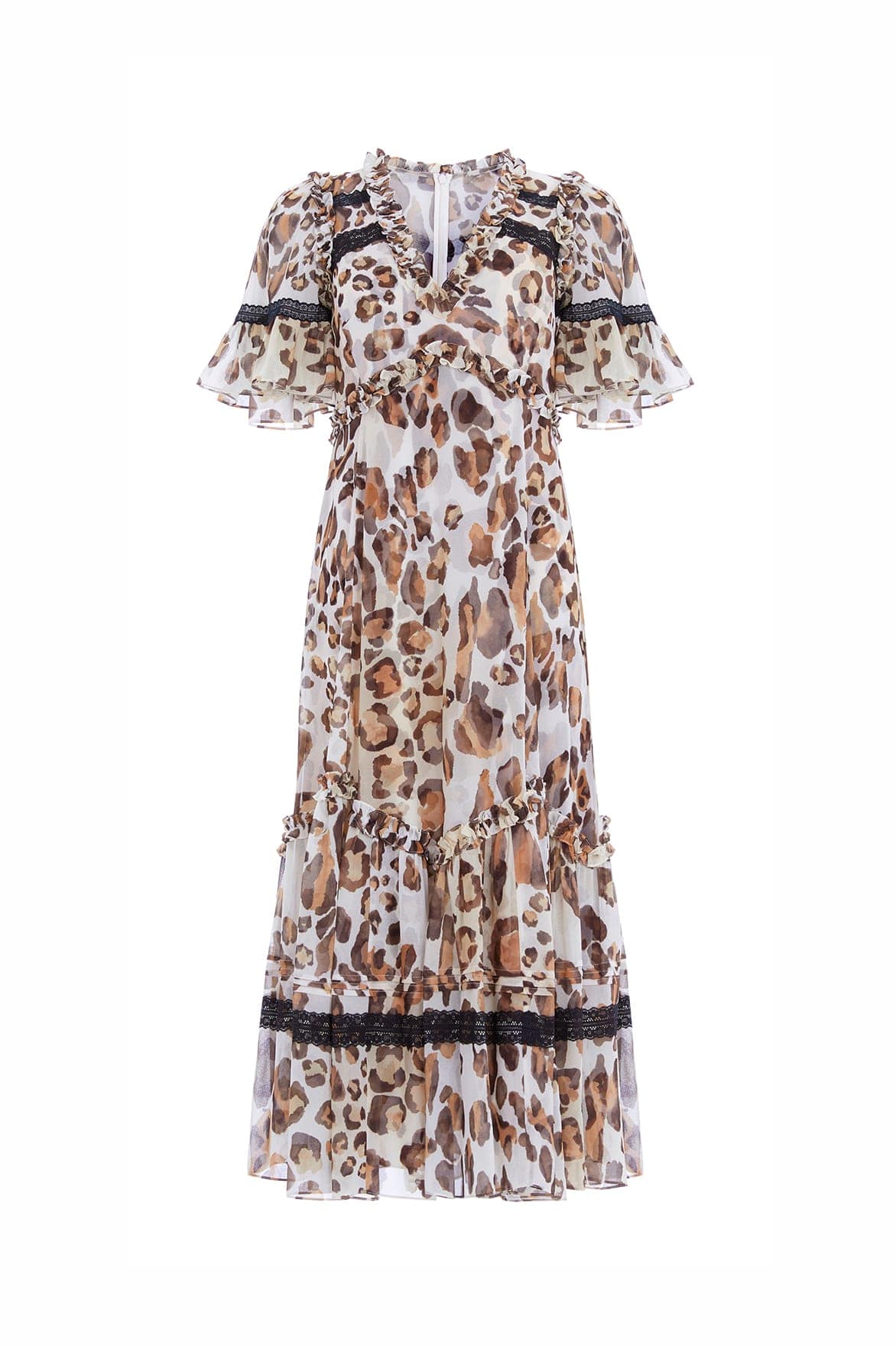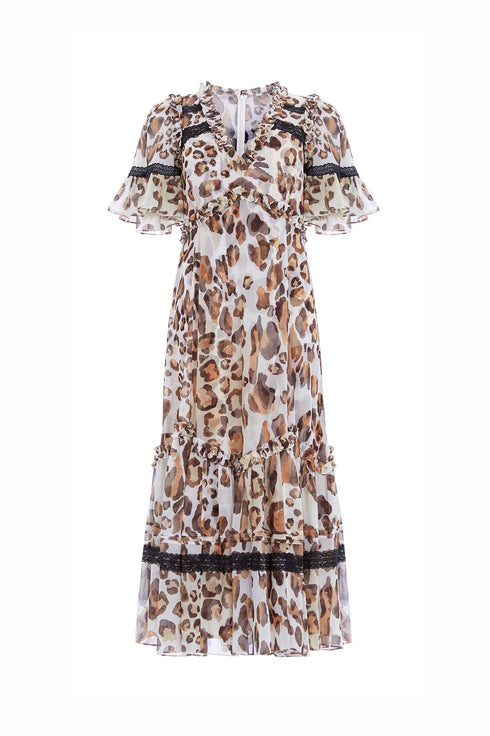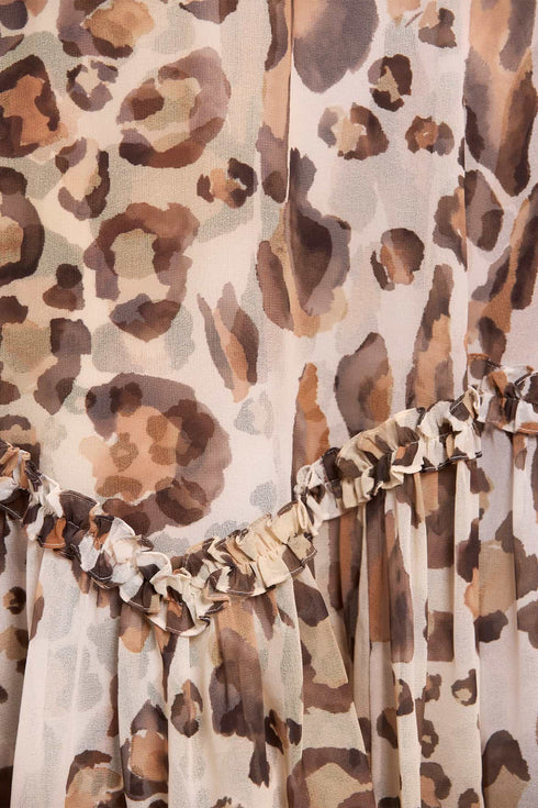 The Leopard Sonata Georgette Ballerina Dress in Moonshine. This statement print was hand-painted in-house using watercolour, with soft leopard motifs varying in scale and showcasing watery definition. Created in soft georgette fabric, it creates a flowing silhouette. The semi-sheer nature of the fabric allows the layered printed lining to show through, adding extra dimension to this beautiful print artwork. Inspired by vintage Victorian garments, it features lace insert detailing in perfectly engineered panelling. The perfect dress to take you from day to night.