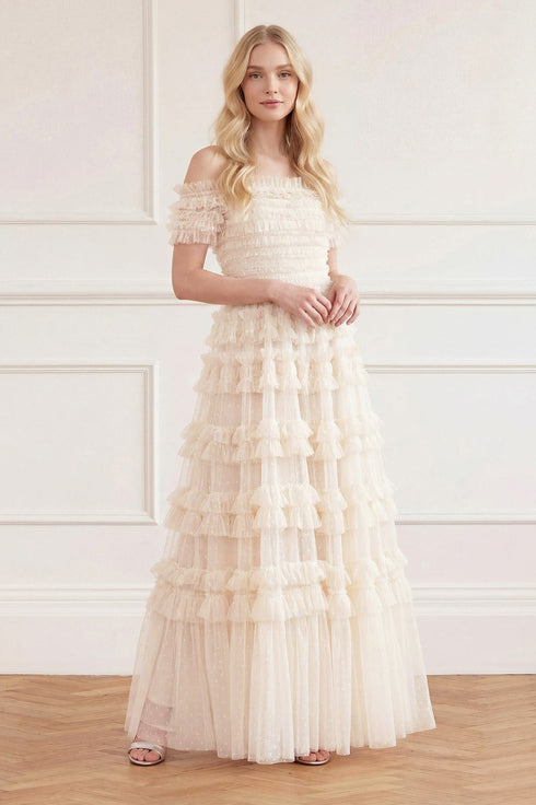 The Lisette Ruffle Off Shoulder Gown in Champagne. This statement gown has an elegant off-the-shoulder design inspired by Hollywood styling. Crafted with textile tulle and double-stitched frills for a dramatic, romantic effect. Features an integrated corset for a perfect fit and to hold the silhouette. Expect all eyes on you in this romantic gown.