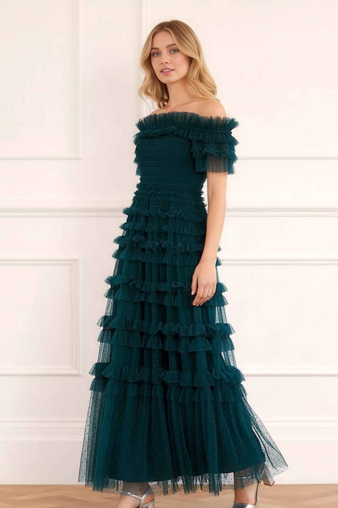 The Lisette Ruffle Off Shoulder Gown in Emerald. This statement gown has an elegant off-the-shoulder design inspired by Hollywood styling. Crafted with textile tulle and double-stitched frills for a dramatic, romantic effect. Features an integrated corset for a perfect fit and to hold the silhouette. Expect all eyes on you in this romantic gown.