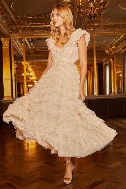 The Lola Backless Ballerina Dress in Parchment, a beautiful new addition for the season. Adorned with signature Needle & Thread elements, this dress features soft tulle and delicately gathered frills, creating a frothy, engineered texture. The backless design adds a romantic, playful touch, while the ballerina-length skirt enhances its graceful silhouette. Perfect for weddings, birthdays, or any special occasion, this dress promises to be a showstopper.