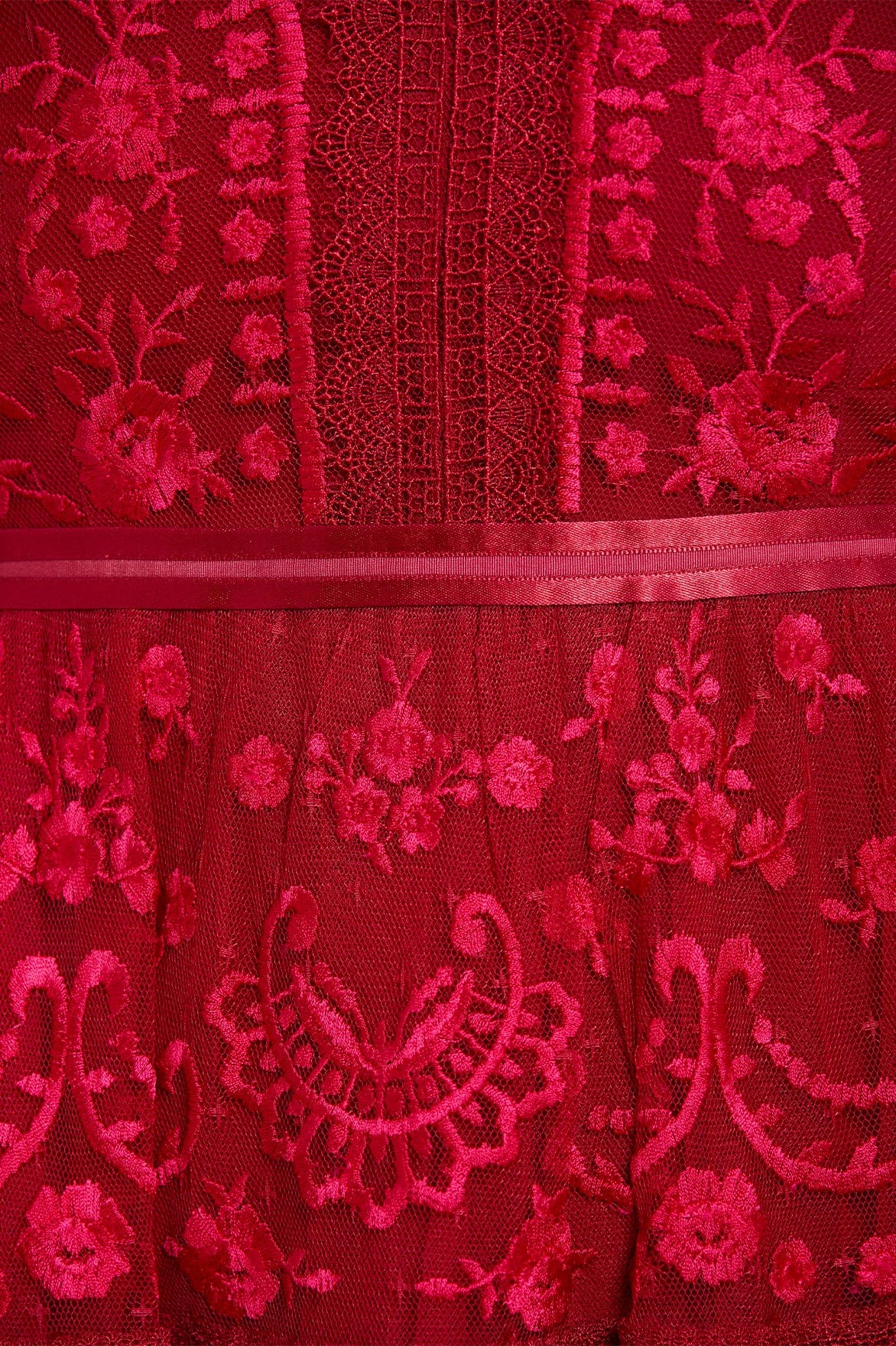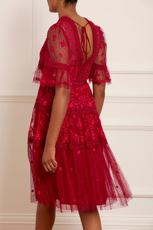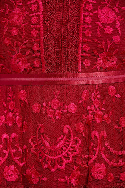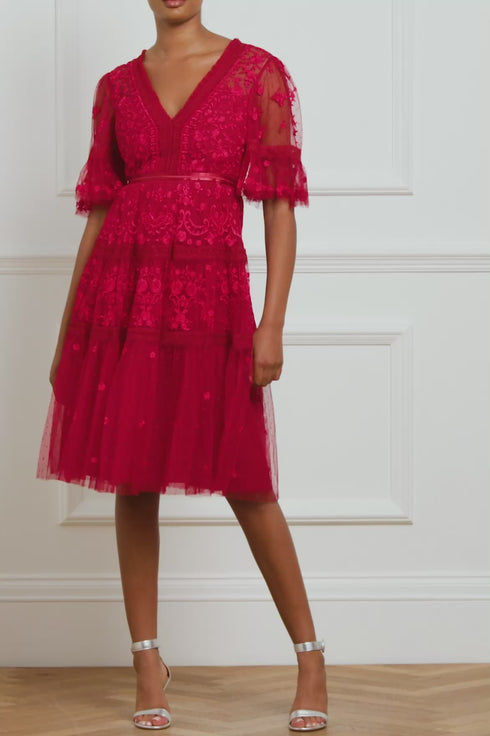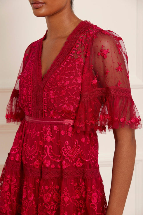 The Lottie Lace Midi Dress in Deep Red. A signature Needle & Thread style, updated for the new season ahead. Taking inspiration from Victorian lace, the Lottie features intricately embroidered artwork in a romantic red on delicate tulle. Lace trims border the neckline and frame each tier of the skirt. This embroidered lace dress has sheer, romantic sleeves and our signature grosgrain ribbon at the waist. The perfect dress to take you from day to night.