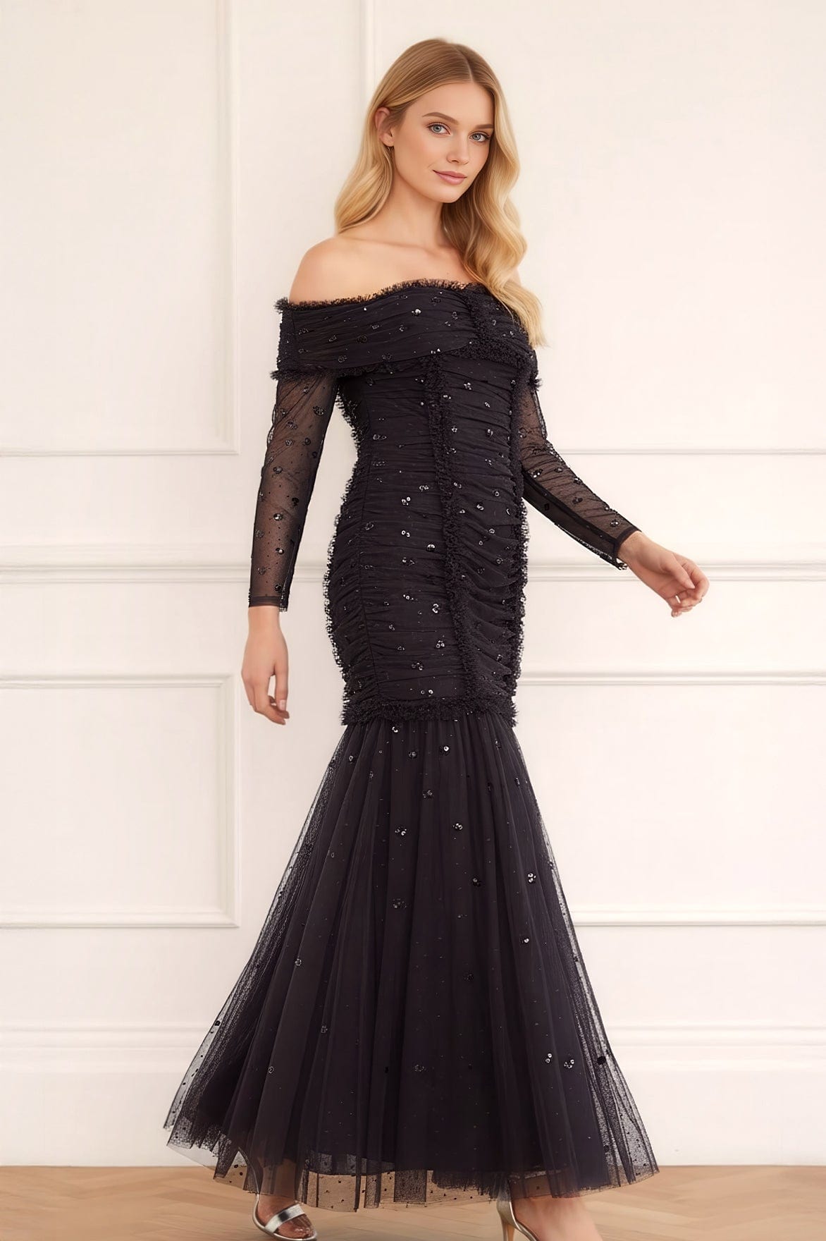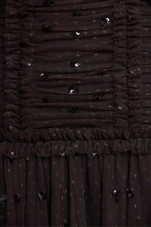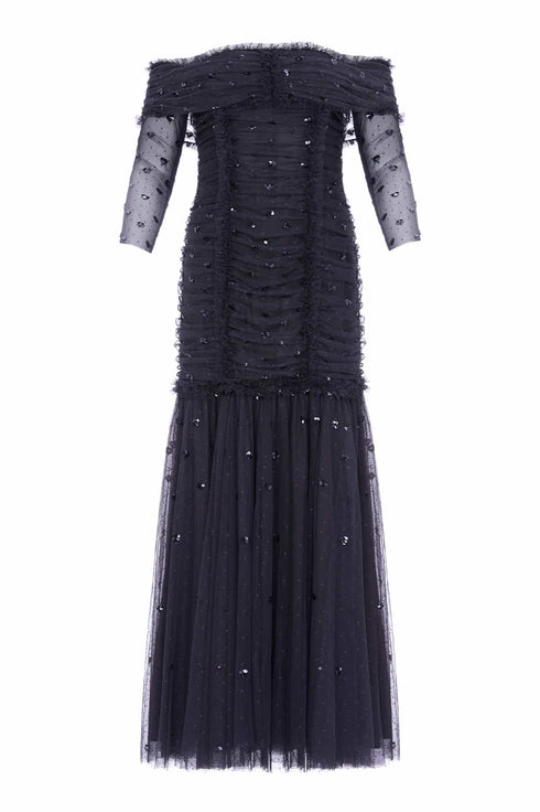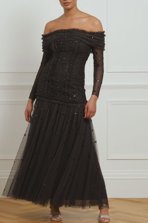 The Love Heart Rouched 0ff-Shoulder Gown in Graphite. This gown is decorated with sequins in love-heart motifs creating an all-over shimmering effect. Beautifully designed with a figure hugging silhouette featuring gentle ruching throughout the body to create a flattering effect. Developed in power mesh fabric for stretch and comfort. A season favourite at Needle & Thread HQ.