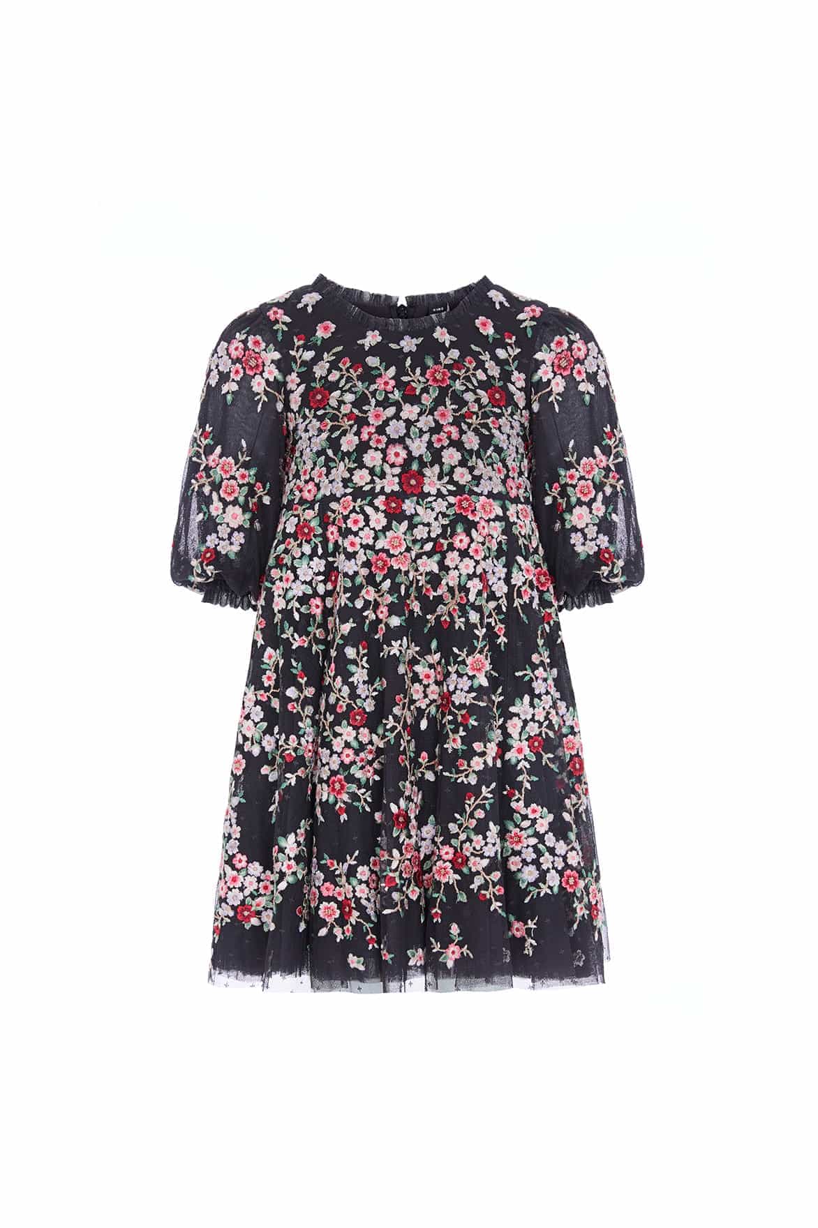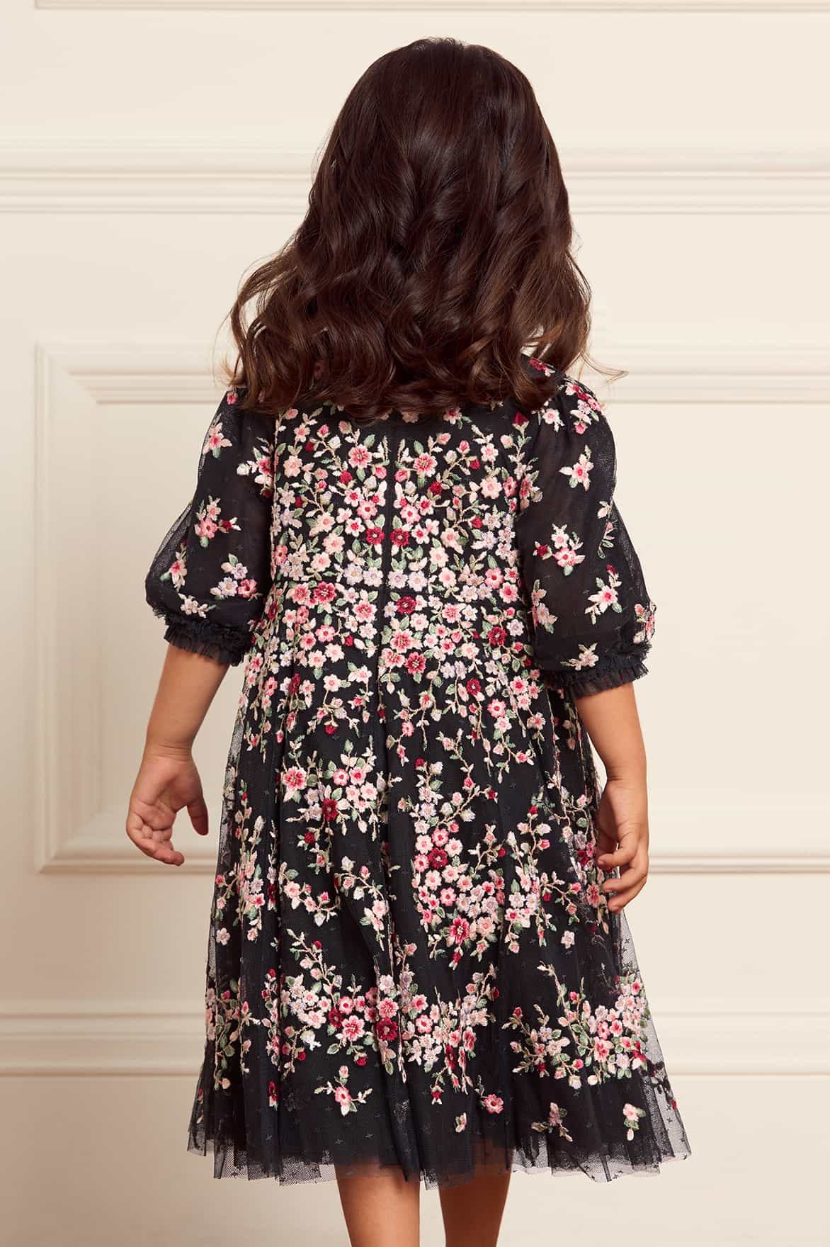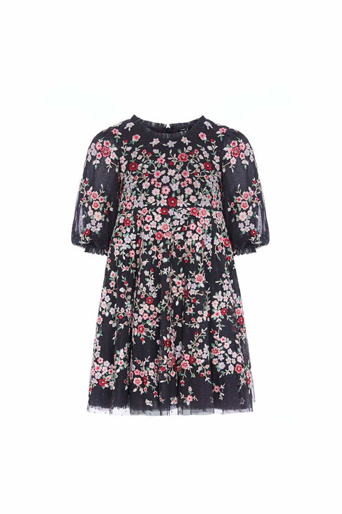 The Lunaria Wreath KIDS Dress in Graphite/Multi. This beautifully decorated style is embroidered with delicate florals in a scattered garland artwork, inspired by an early 1900s design. This style is embroidered with rich pastel tones to create a perfect painterly effect. The playful puff sleeves are adorned with tulle ruffle tiers and delicate scattered floral motifs. Crafted with soft tulle frills at the shoulders and neckline, adds a playful, frothy texture. The skirt features generous layers of net and tulle, with a full hemline perfect for twirling. A pretty dress for your little one's next event.