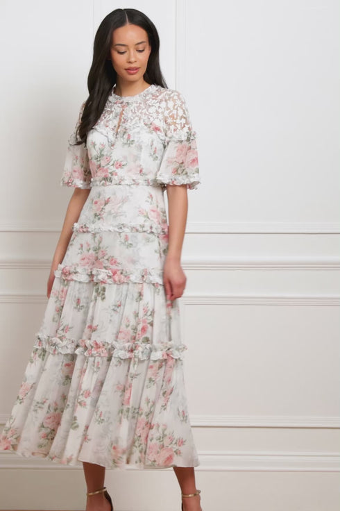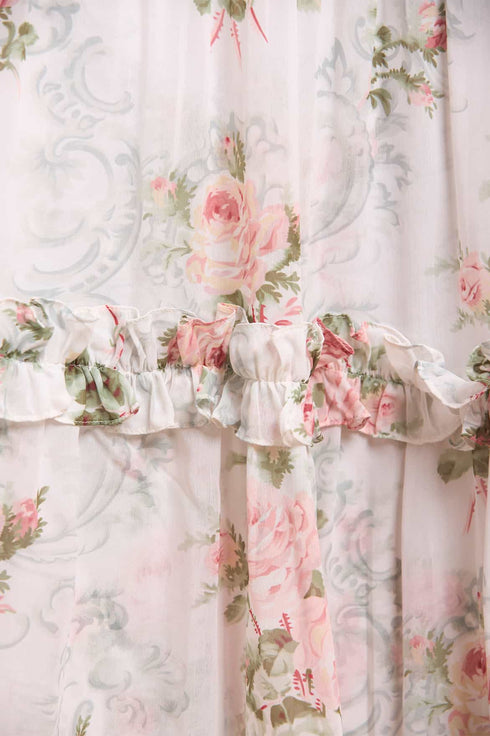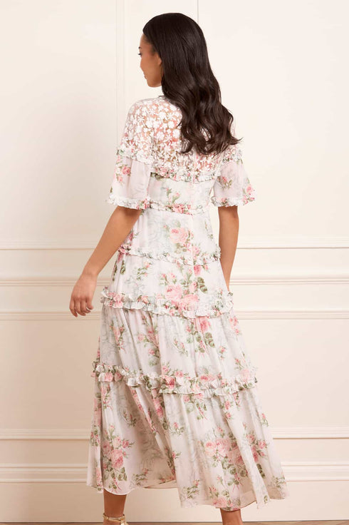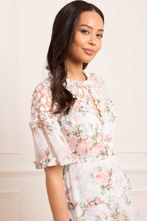 The Madame Rose Carla Chiffon Ankle Gown in Moonshine. This gown features an exquisite 1850s-inspired floral print, with luxurious rose bouquets and ornate scroll details. Crafted from the softest chiffon, it features embroidered tulle panels at the yoke and sleeve head, adorned with delicate floral motifs. The keyhole neckline, fluted sleeves, and tiered skirt are finished with signature Needle & Thread frills and tiny pin hems. The perfectly proportioned skirt, with soft gathers, creates an enchanting, romantic silhouette.
