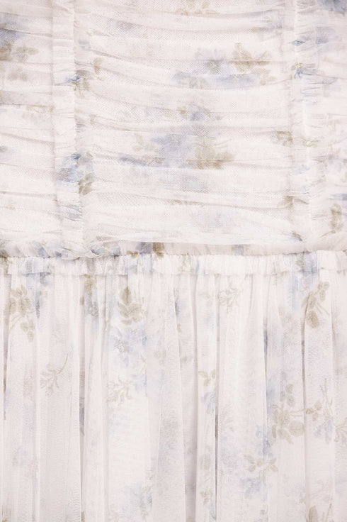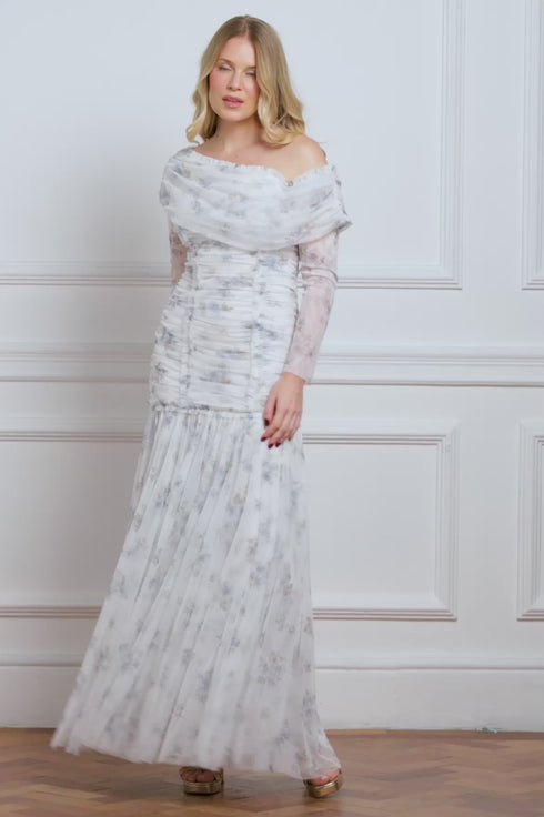 NEW SEASON. The Magnolia Ditsy One-Shoulder Rouched Gigi Gown in Moonshine/Skylight. Features a one-shoulder silhouette with gentle ruching and delicate ditsy floral print. Crafted from airy fabric for effortless drape, this gown is both contemporary and romantic.