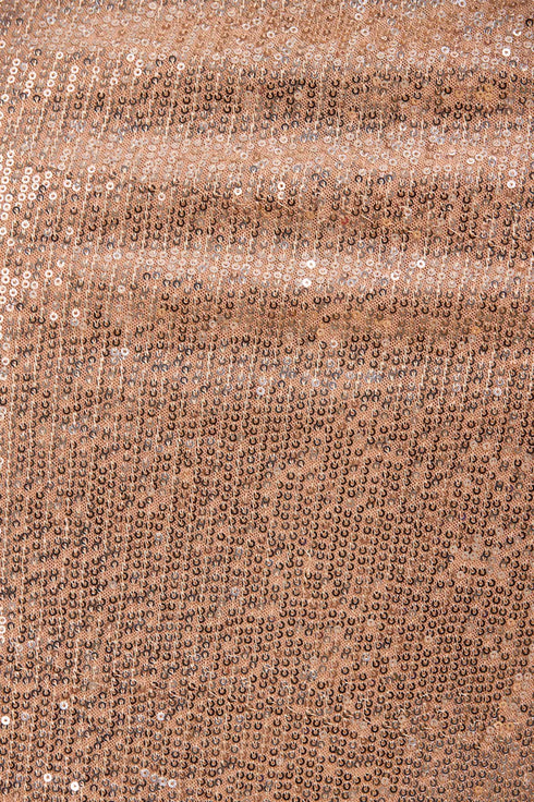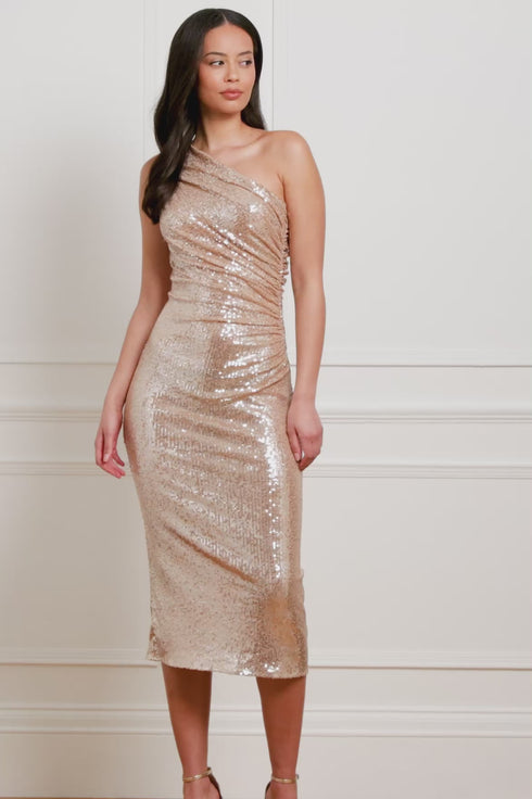 The Malia One-Shoulder Ballerina Dress in Butterscotch. This sophisticated one-shoulder dress is designed to sculpt a flattering silhouette with soft ruching across the body, adding an effortlessly elegant touch. Crafted from a specially developed stretch power-mesh, the glittering all-over sequin fabric offers both comfort and ease of wear, ensuring a flawless fit. The fabric features the finest sequins, meticulously hand-stitched to a stretch mesh base, creating a breathtaking, continuous shimmer that captures the light with every movement. A true embodiment of luxury, this dress is the perfect balance of opulence and wearability.