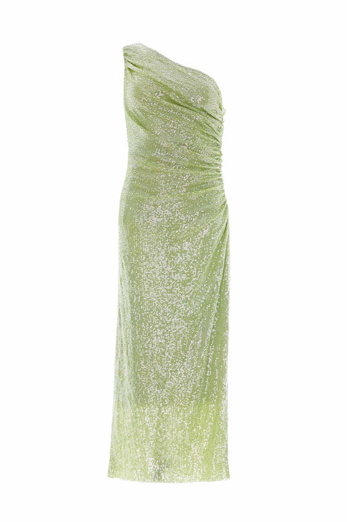 The Malia One-Shoulder Ballerina Dress in Meadow. This sophisticated one-shoulder dress is designed to sculpt a flattering silhouette with soft ruching across the body, adding an effortlessly elegant touch. Crafted from a specially developed stretch power-mesh, the glittering all-over sequin fabric offers both comfort and ease of wear, ensuring a flawless fit. The fabric features the finest sequins, meticulously hand-stitched to a stretch mesh base, creating a breathtaking, continuous shimmer that captures the light with every movement. A true embodiment of luxury, this dress is the perfect balance of opulence and wearability.