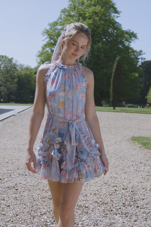 The Mariannes Floral Chiffon Sleeveless Micro Mini Dress in Sky Blue, inspired by Victorian botanist Marianne North. This dress features a vibrant floral print with bold brushstrokes. This dress has a halter neckline and a voluminous trapeze silhouette. Beautifully decorated with chevron frills on the skirt, while a gathered hem tier adds volume. A slim chiffon tie belt adds versatility, perfect for various styling options.