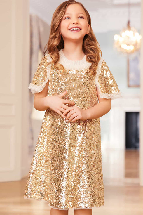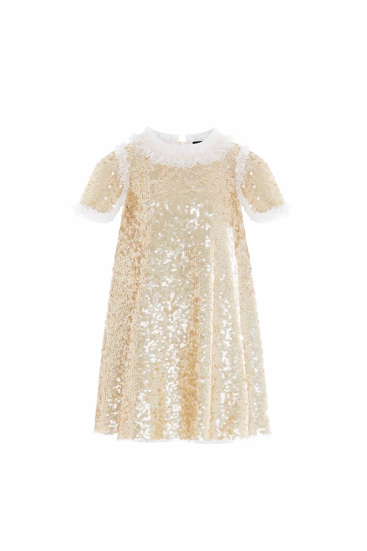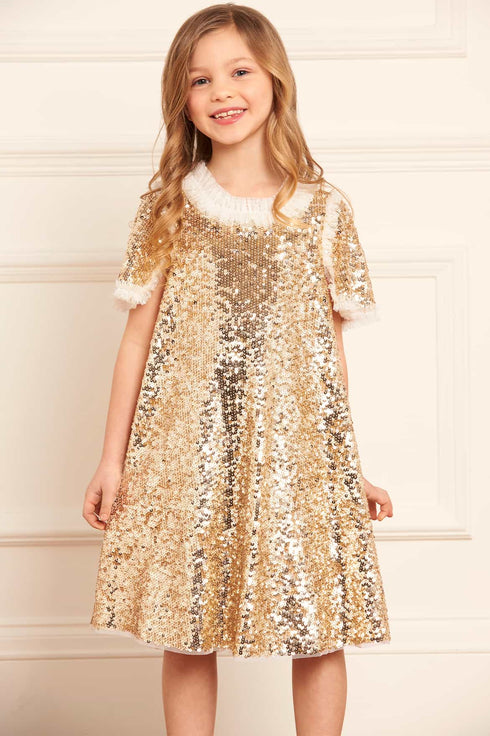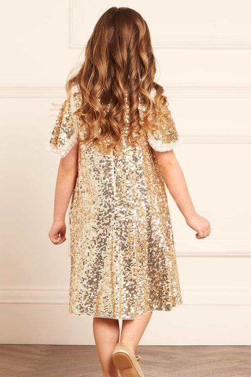 The Matilda Dress in Gold. This beautiful dress is decorated with shimmering sequins, creating an ultimate sparkle. Designed with square cut sleeves trimmed with tulle ruffles to add a Needle & Thread signature look. Update your little one's wardrobe with the ultimate fairy-tale dress of the season.